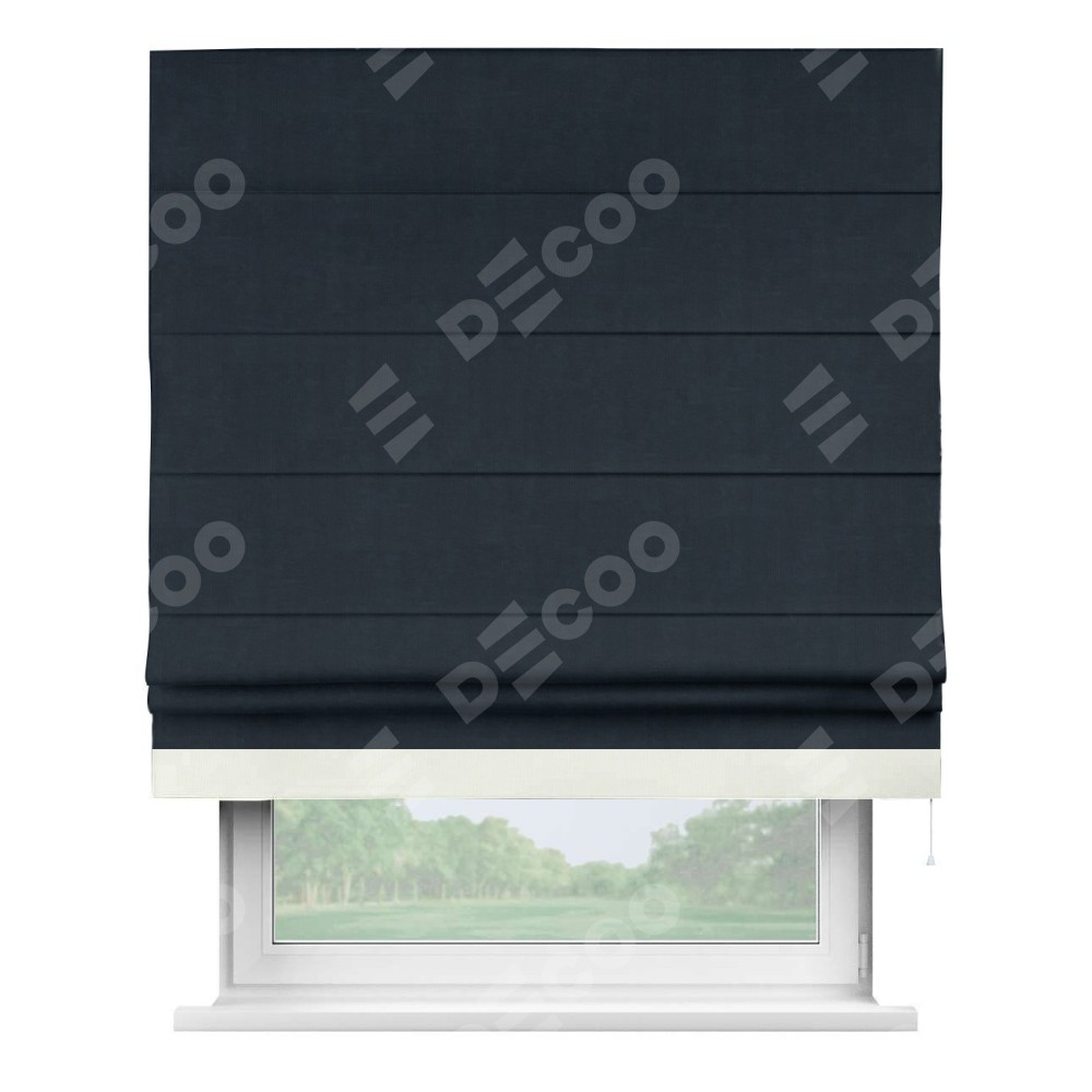Римская штора производителя «Cortin», используется для проёма, пошита из ткани канвас тёмно-синий, артикул ткани v-206. Отделка шторы кантом «Джестер» (молочный v-93), ткань для канта используется из канваса разной расцветки на выбор. Имеет универсальный механизм и подходит для монтажа: на потолок, на стену и в нишу.