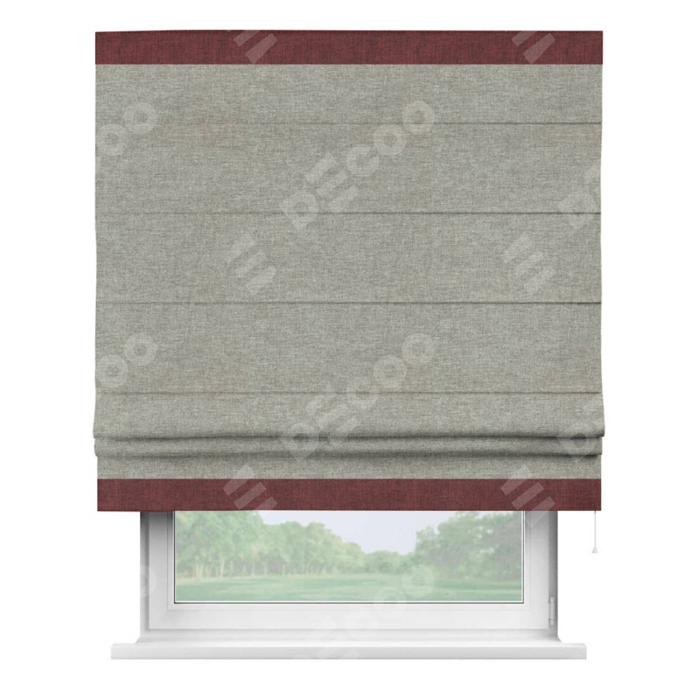 Римская штора производителя «Cortin», используется для проёма, пошита из ткани лён кашемир серый, артикул 17208. Отделка шторы кантом «Горизонт», ткань для канта используется из льна разной расцветки на выбор. Имеет универсальный механизм и подходит для монтажа: на потолок, на стену и в нишу.