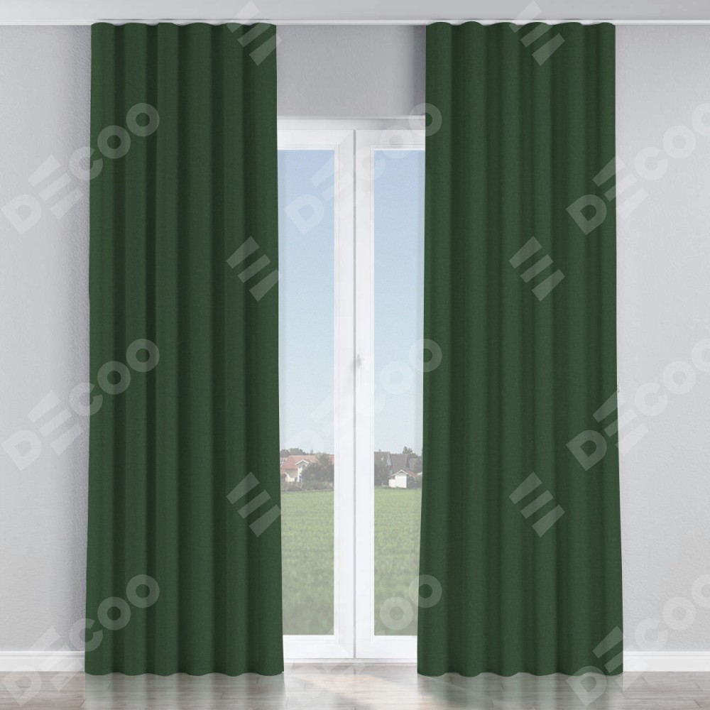 Комплект прямых штор, от производителя «Cortin», пошиты из ткани канвас глубокий зелёный, артикул ткани v-588. С изнаночной стороны в верхней части штор пристрачивается шторная лента с декоративными складками «Волна». Для создания элегантных складок прямые шторы шьются по стандарту с коэффициентом 1:2 (на 100 см. ширины проёма 200 см. ширины ткани).