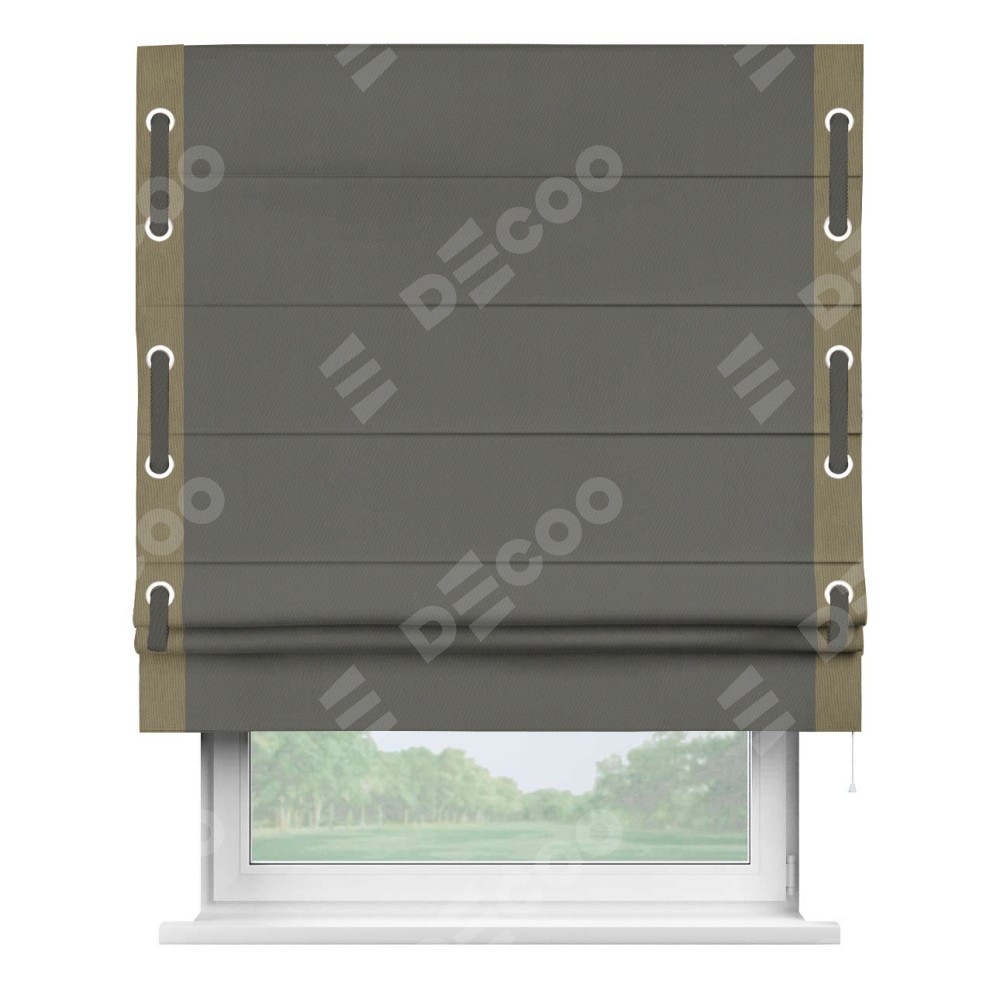 Римская штора «Кортин» для проема, блэкаут однотонный тёмно-серый с кантом Стрим Дуо (люверсы с пояском)