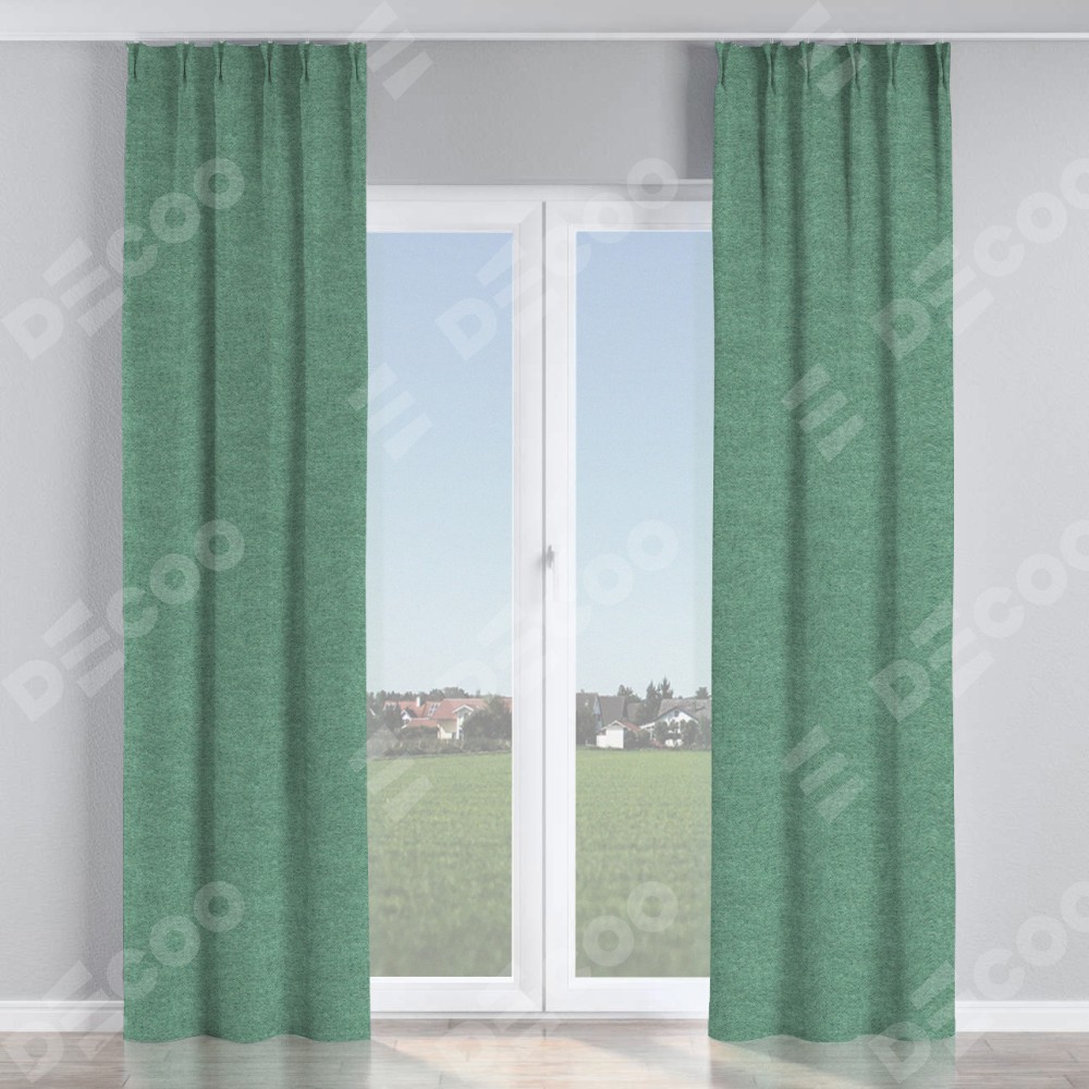 Комплект прямых штор, от производителя «Cortin», пошиты из ткани твид блэкаут бирюзовый, артикул ткани 90934. С изнаночной стороны в верхней части штор пристрачивается шторная лента с декоративными складками «Кустик». Для создания элегантных складок прямые шторы шьются по стандарту с коэффициентом 1:2 (на 100 см. ширины проёма 200 см. ширины ткани).