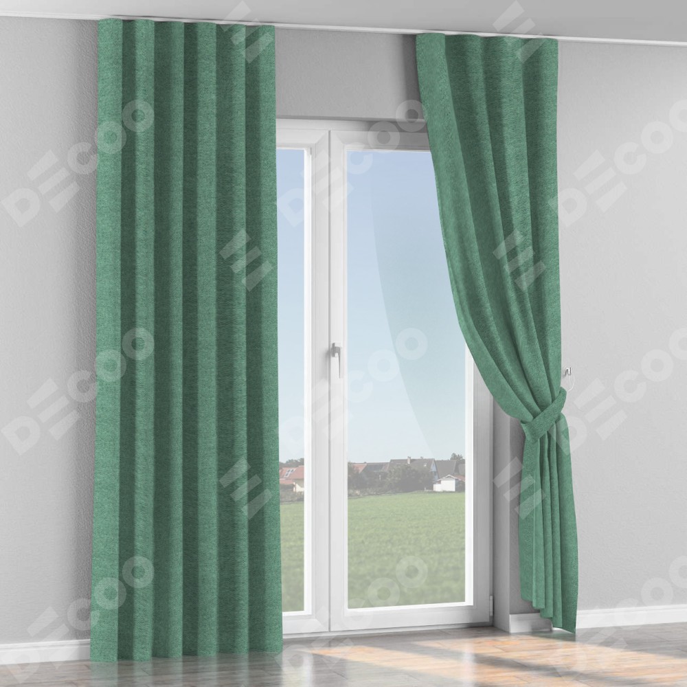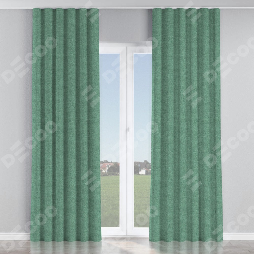 Комплект прямых штор, от производителя «Cortin», пошиты из ткани твид блэкаут бирюзовый, артикул ткани 90934. С изнаночной стороны в верхней части штор пристрачивается шторная лента с декоративными складками «Волна». Для создания элегантных складок прямые шторы шьются по стандарту с коэффициентом 1:2 (на 100 см. ширины проёма 200 см. ширины ткани).