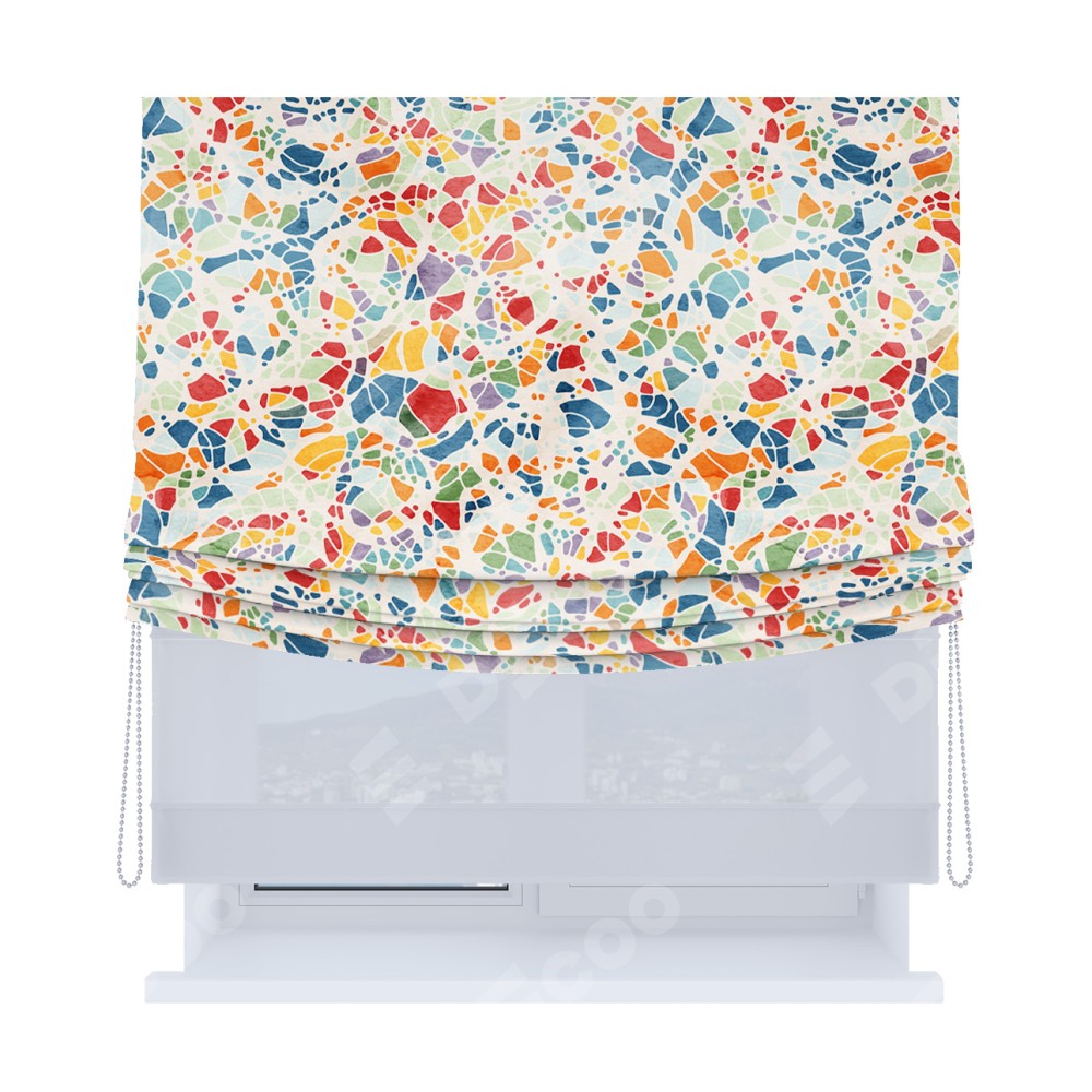 Римская штора день-ночь производителя «Cortin», используется для проёма, пошита из двух полотен, с лицевой блэкаут с нанесением сублимационной печати «Калейдоскоп», вторая ткань тюль (по стандарту комплектуется тюль белого цвета артикул V-01). Имеет универсальный механизм и подходит для монтажа: на потолок, на стену и в нишу. Удобное управление каждой шторой отдельно.