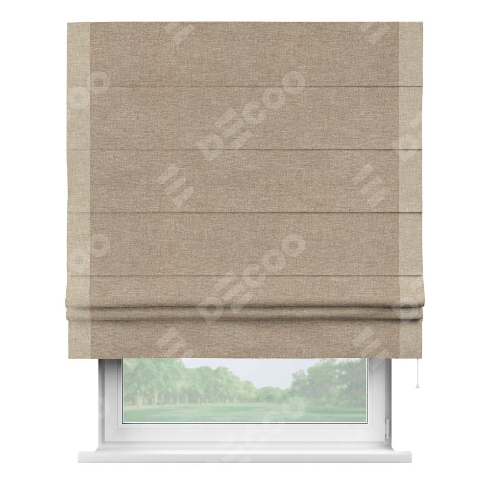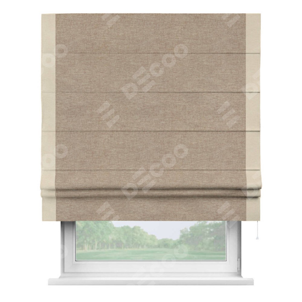 Римская штора производителя «Cortin», используется для проёма, пошита из ткани лён кашемир коричневый, артикул 21614. Отделка шторы кантом «Стрим Дуо», ткань для канта используется из льна разной расцветки на выбор. Имеет универсальный механизм и подходит для монтажа: на потолок, на стену и в нишу.
