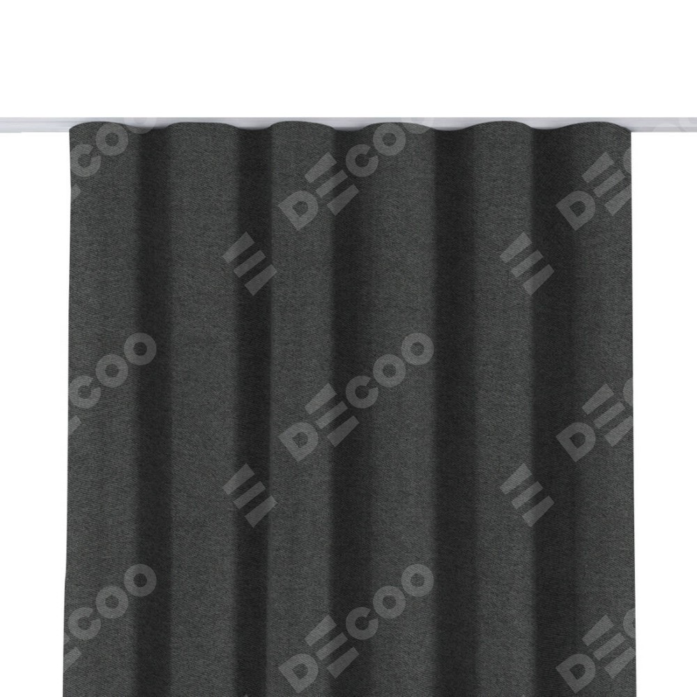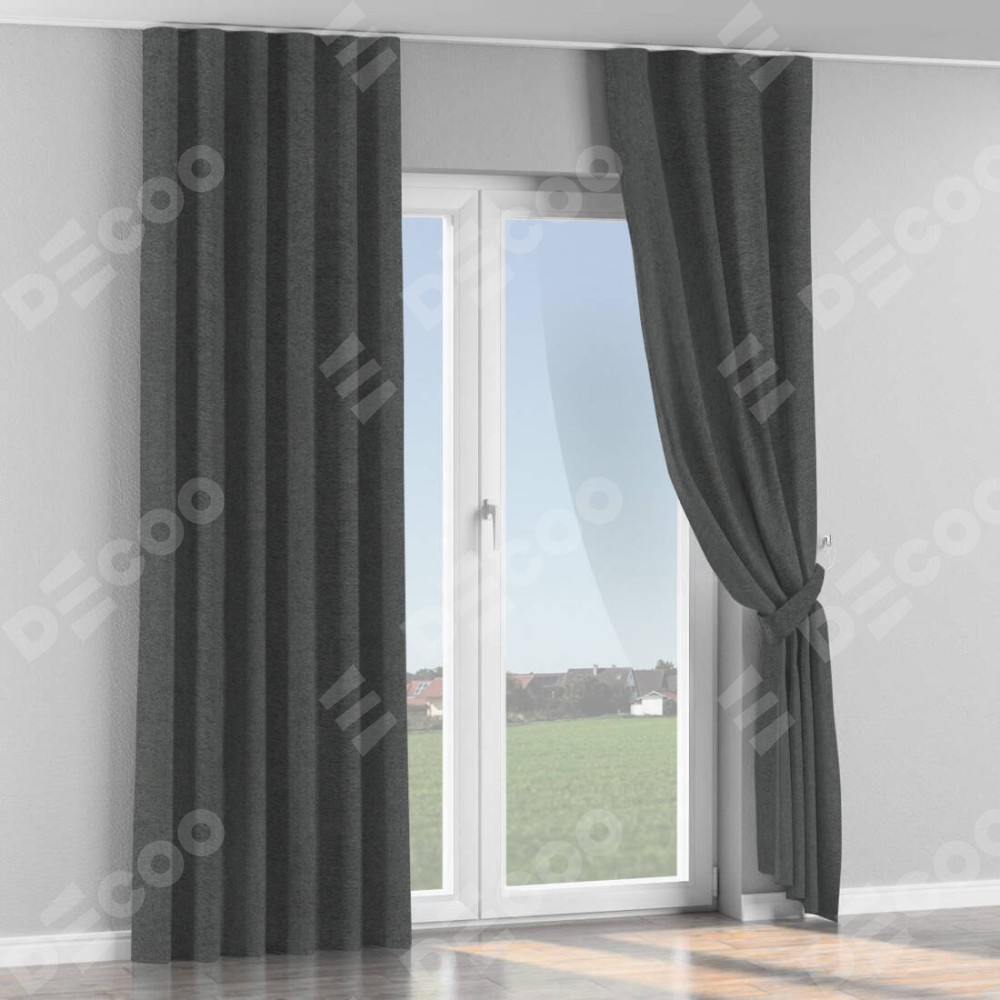 Комплект прямых штор, от производителя «Cortin», пошиты из ткани твид блэкаут тёмно-серый, артикул ткани 90938. С изнаночной стороны в верхней части штор пристрачивается шторная лента с декоративными складками «Волна». Для создания элегантных складок прямые шторы шьются по стандарту с коэффициентом 1:2 (на 100 см. ширины проёма 200 см. ширины ткани).