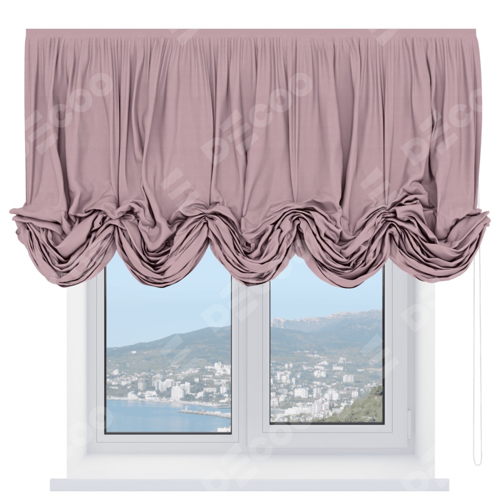 Австрийская штора производителя «Cortin», используется для проёма, пошита из ткани вельвет розовая пудра, артикул ткани 14132. Имеет универсальный механизм и подходит для монтажа: на потолок и на стену.