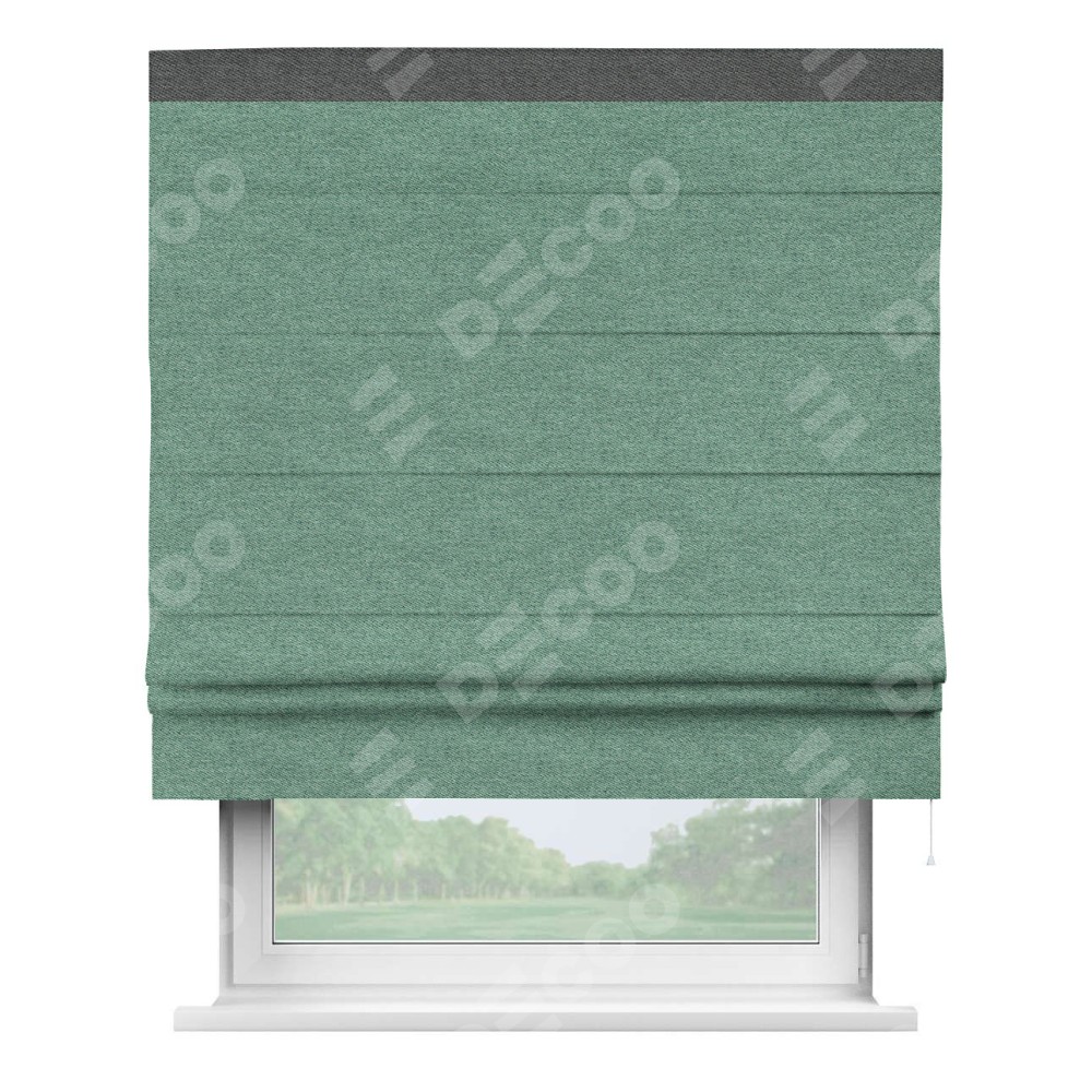 Римская штора производителя «Cortin», используется для проёма, пошита из ткани твид блэкаут бирюзовый, артикул 90934. Отделка шторы кантом «Кинг», ткань для канта используется из твида разной расцветки на выбор. Имеет универсальный механизм и подходит для монтажа: на потолок, на стену и в нишу.
