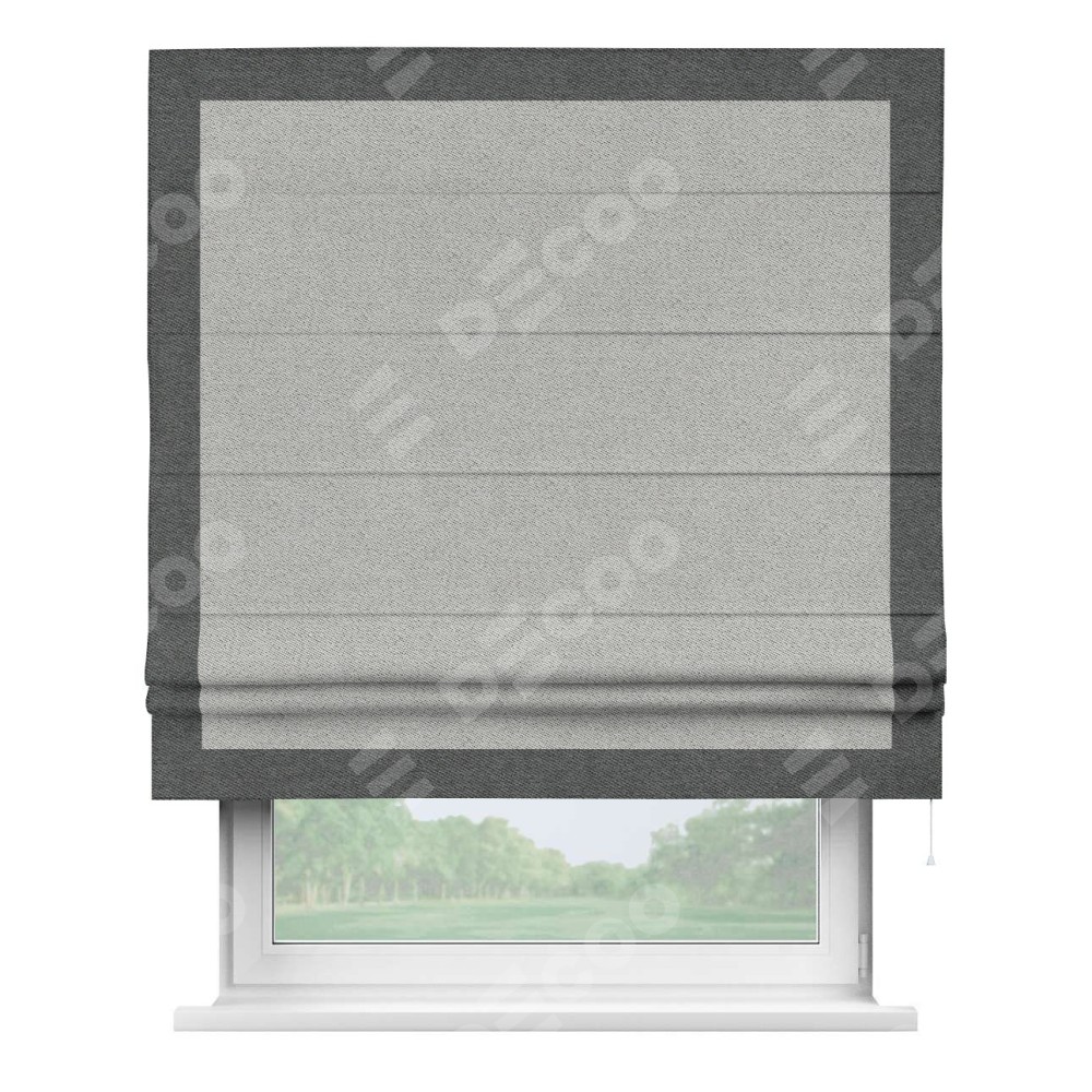 Римская штора производителя «Cortin», используется для проёма, пошита из ткани твид блэкаут светло-серый, артикул 90936. Отделка шторы кантом «Чесс», ткань для канта используется из твида разной расцветки на выбор. Имеет универсальный механизм и подходит для монтажа: на потолок, на стену и в нишу.