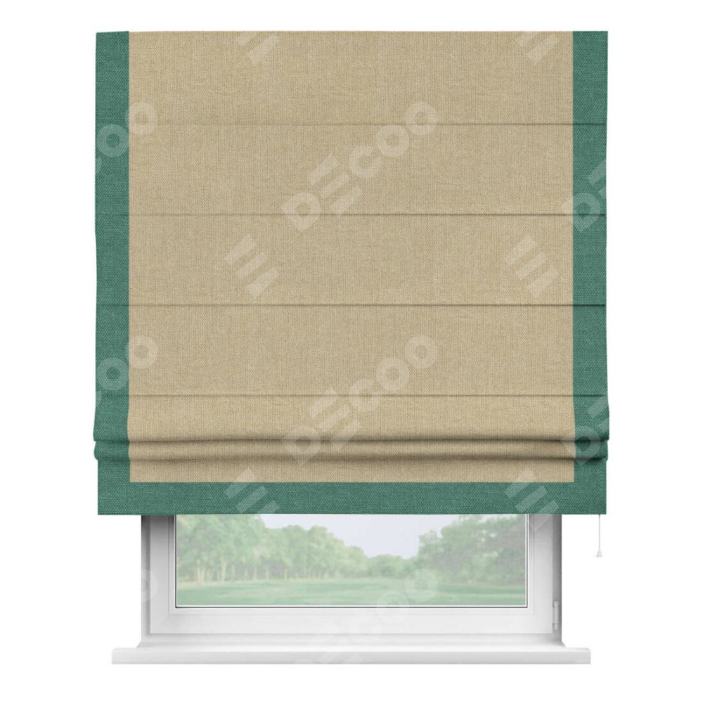 Римская штора с отделкой кантом «Виктория», пошита из ткани лён димаут песочный, артикул: 16256. представляет собой элегантное решение для оконного оформления. Кант по бокам и снизу шторы добавляет изысканности и аккуратности внешнему виду, подчеркивая линии и форму шторы. Этот элемент декора не только украшает, но и выполняет практическую функцию, защищая края ткани от износа. Кант может быть выполнен в контрастном или гармонирующем цвете, что позволяет добиться различных стилевых эффектов и легко вписать штору в интерьер комнаты.