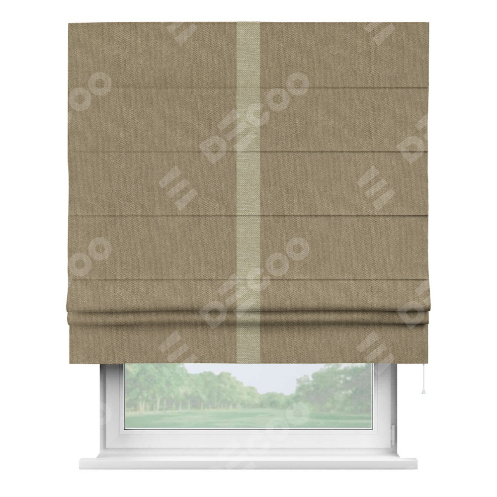 Римская штора пошита из ткани лён димаут тёмно-бежевый, артикул: 16261, с отделкой кантом «Хайвэй» представляет собой уникальное и смелое дизайнерское решение, где кант расположен вертикально посередине шторы. Этот дизайн не только выделяет штору среди других вариантов оформления окон, но и создает интересный визуальный акцент, привлекая внимание к центру окна и разделяя штору на визуальные зоны. Такой нестандартный подход добавляет динамичности интерьеру и может быть использован для подчеркивания особенностей оформления помещения.
