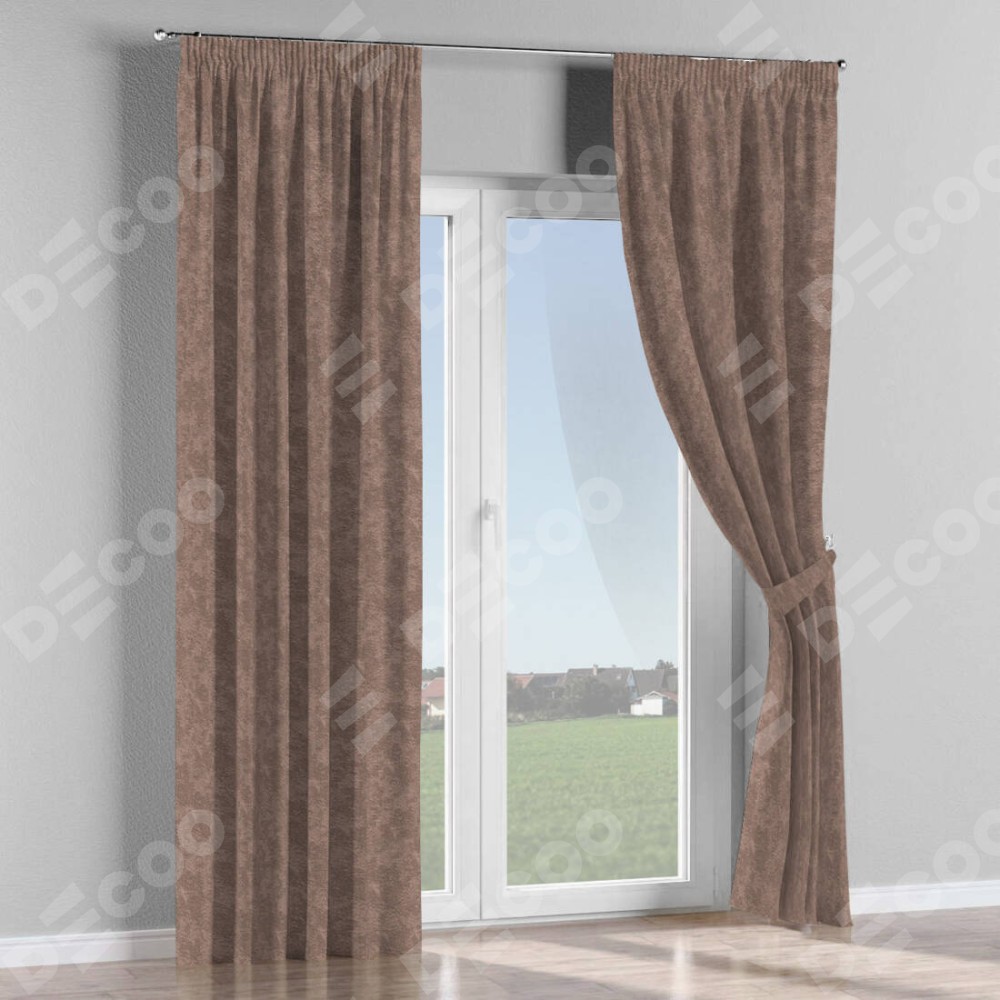 Комплект прямых штор, от производителя «Cortin», пошиты из ткани софт мрамор капучино, артикул ткани 93577. С изнаночной стороны в верхней части штор пристрачивается шторная лента с декоративными складками «Карандаш». Для создания элегантных складок прямые шторы шьются по стандарту с коэффициентом 1:2 (на 100 см. ширины проёма 200 см. ширины ткани).