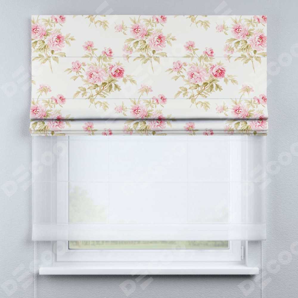 Двойная римская штора «День-ночь» от производителя Cortin предназначена для использования в проёмах. Эта штора уникальна тем, что состоит из двух полотен. На лицевой стороне находится блэкаут с нанесением сублимационной печати «Английский шебби-шик», обеспечивающий эффективное затемнение. В комплект также входит вторая ткань — легкий белый тюль (артикул: V-01), который добавляет изящества и легкости оформлению окна. Кроме того, доступны и другие разновидности ткани тюль, выбор которых доступен по ссылке .