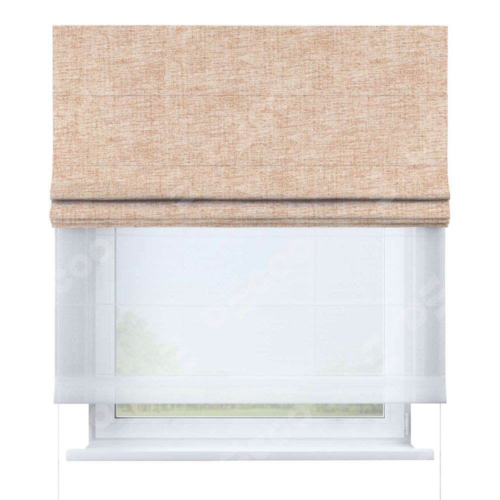 Двойная римская штора «День-ночь» от производителя Cortin предназначена для использования в проёмах. Эта штора уникальна тем, что состоит из двух полотен. На лицевой стороне находится рогожка димаут персиковый (артикул: 91016), обеспечивающая комфортное затемнение. В комплект также входит вторая ткань — легкий белый тюль (артикул: V-01), который добавляет изящества и легкости оформлению окна. Кроме того, доступны и другие разновидности ткани тюль, выбор которых доступен по ссылке .