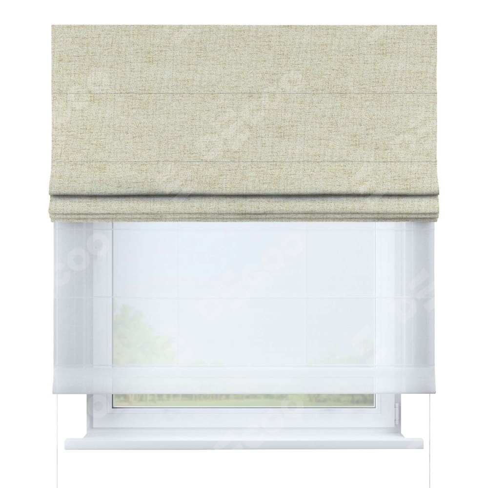 Двойная римская штора «День-ночь» от производителя Cortin предназначена для использования в проёмах. Эта штора уникальна тем, что состоит из двух полотен. На лицевой стороне находится рогожка димаут золотой песок (артикул: 91015), обеспечивающий эффективное затемнение. В комплект также входит вторая ткань — легкий белый тюль (артикул: V-01), который добавляет изящества и легкости оформлению окна. Кроме того, доступны и другие разновидности ткани тюль, выбор которых доступен по ссылке .