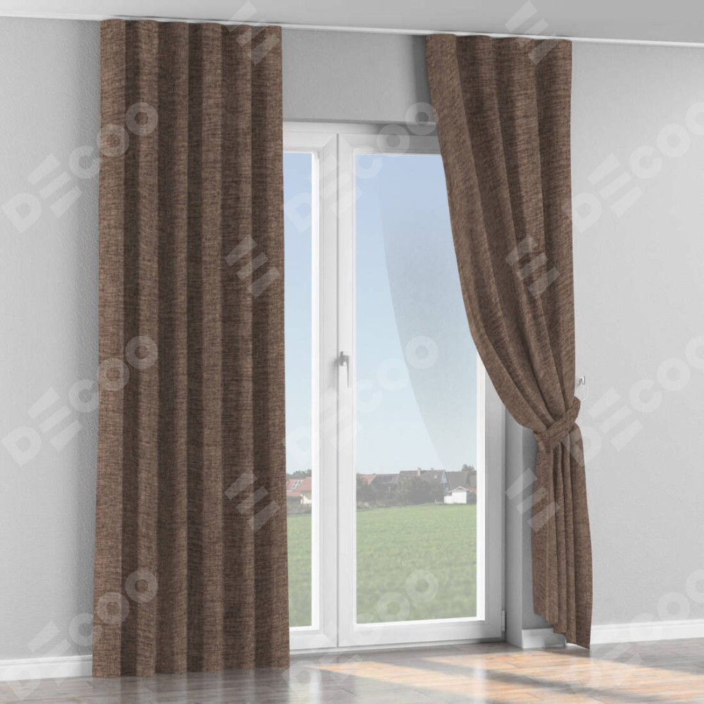 Комплект прямых штор, от производителя «Cortin», пошиты из ткани рогожка димаут коричневый, артикул ткани 91018. С изнаночной стороны в верхней части штор пристрачивается шторная лента с декоративными складками «Волна». Для создания элегантных складок прямые шторы шьются по стандарту с коэффициентом 1:2 (на 100 см. ширины проёма 200 см. ширины ткани).