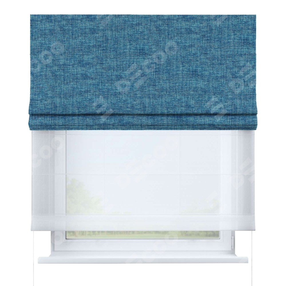 Двойная римская штора «День-ночь» от производителя Cortin предназначена для использования в проёмах. Эта штора уникальна тем, что состоит из двух полотен. На лицевой стороне находится рогожка димаут лазурно-синий (артикул: 91024), обеспечивающий эффективное затемнение. В комплект также входит вторая ткань — легкий белый тюль (артикул: V-01), который добавляет изящества и легкости оформлению окна. Кроме того, доступны и другие разновидности ткани тюль, выбор которых доступен по ссылке .