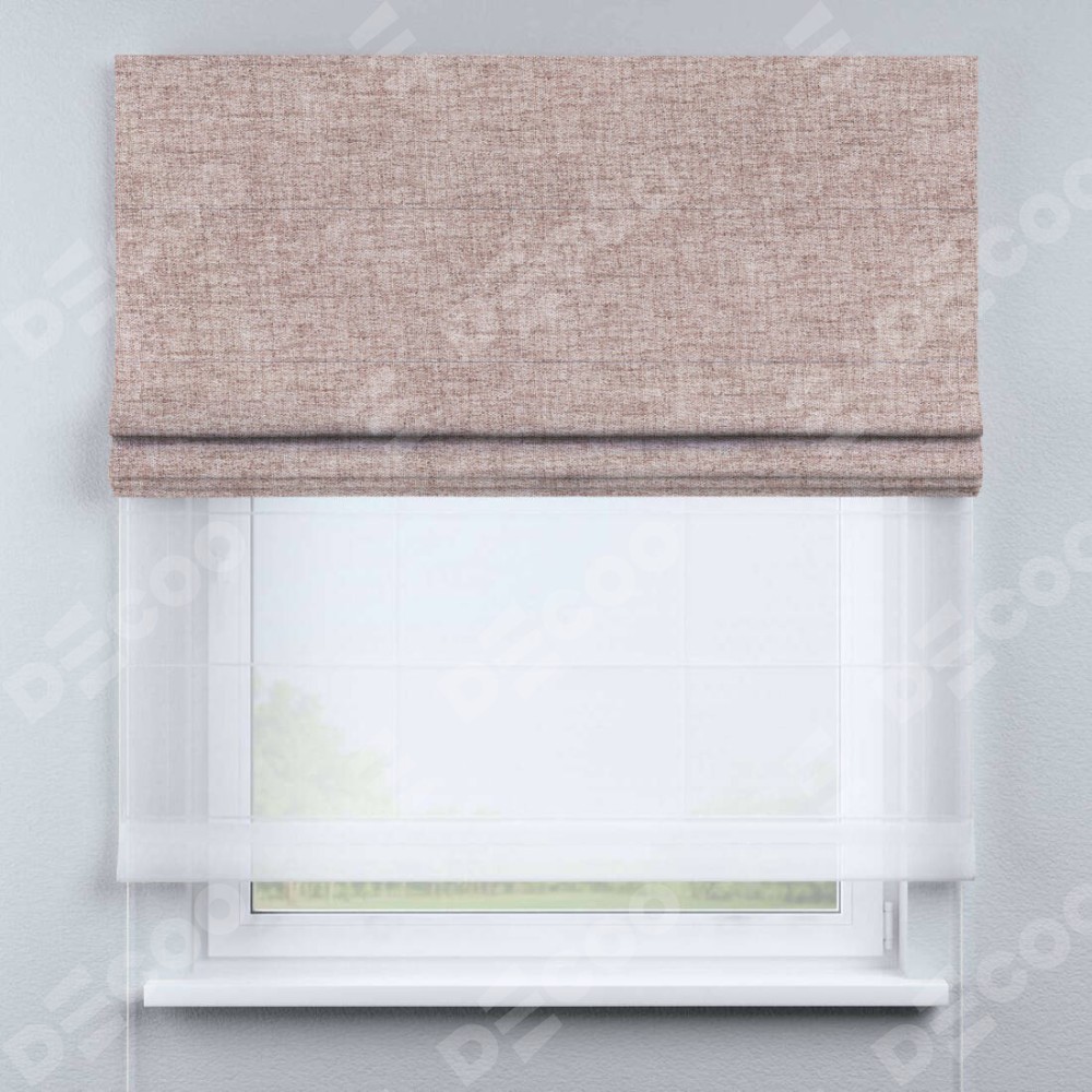 Двойная римская штора «День-ночь» от производителя Cortin предназначена для использования в проёмах. Эта штора уникальна тем, что состоит из двух полотен. На лицевой стороне находится рогожка димаут пыльный розовый (артикул: 91019), обеспечивающий эффективное затемнение. В комплект также входит вторая ткань — легкий белый тюль (артикул: V-01), который добавляет изящества и легкости оформлению окна. Кроме того, доступны и другие разновидности ткани тюль, выбор которых доступен по ссылке .