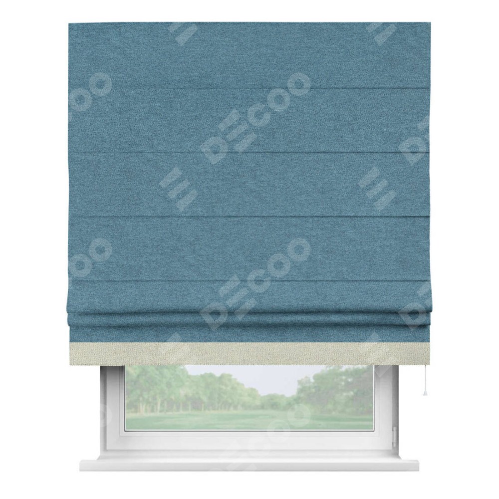 Римская штора пошита из ткани твид блэкаут светло-синий, артикул: 90935, с отделкой кантом «Джестер» выделяется своей уникальной особенностью — кантом, расположенным только снизу шторы. Этот дизайн добавляет оригинальности и игривости оконному оформлению, делая акцент на нижней части шторы и создавая интересный визуальный эффект. Отделка кантом на нижнем крае не только служит эстетической функции, но и способствует увеличению прочности и износостойкости ткани в этом месте.