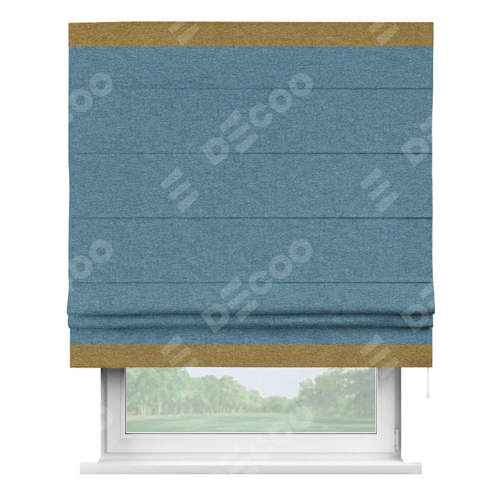 Римская штора пошита из ткани твид блэкаут светло-синий, артикул: 90935, с отделкой кантом «Горизонт» предлагает уникальное дизайнерское решение, при котором кант располагается только вверху и снизу шторы. Такое решение делает акцент на горизонтальных линиях, визуально расширяя пространство и придавая окну более строгий и организованный вид. Отделка кантом в этих ключевых местах не только украшает штору, но и способствует её долговечности, защищая наиболее уязвимые к износу края.