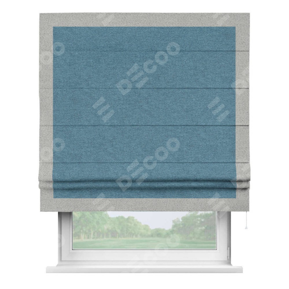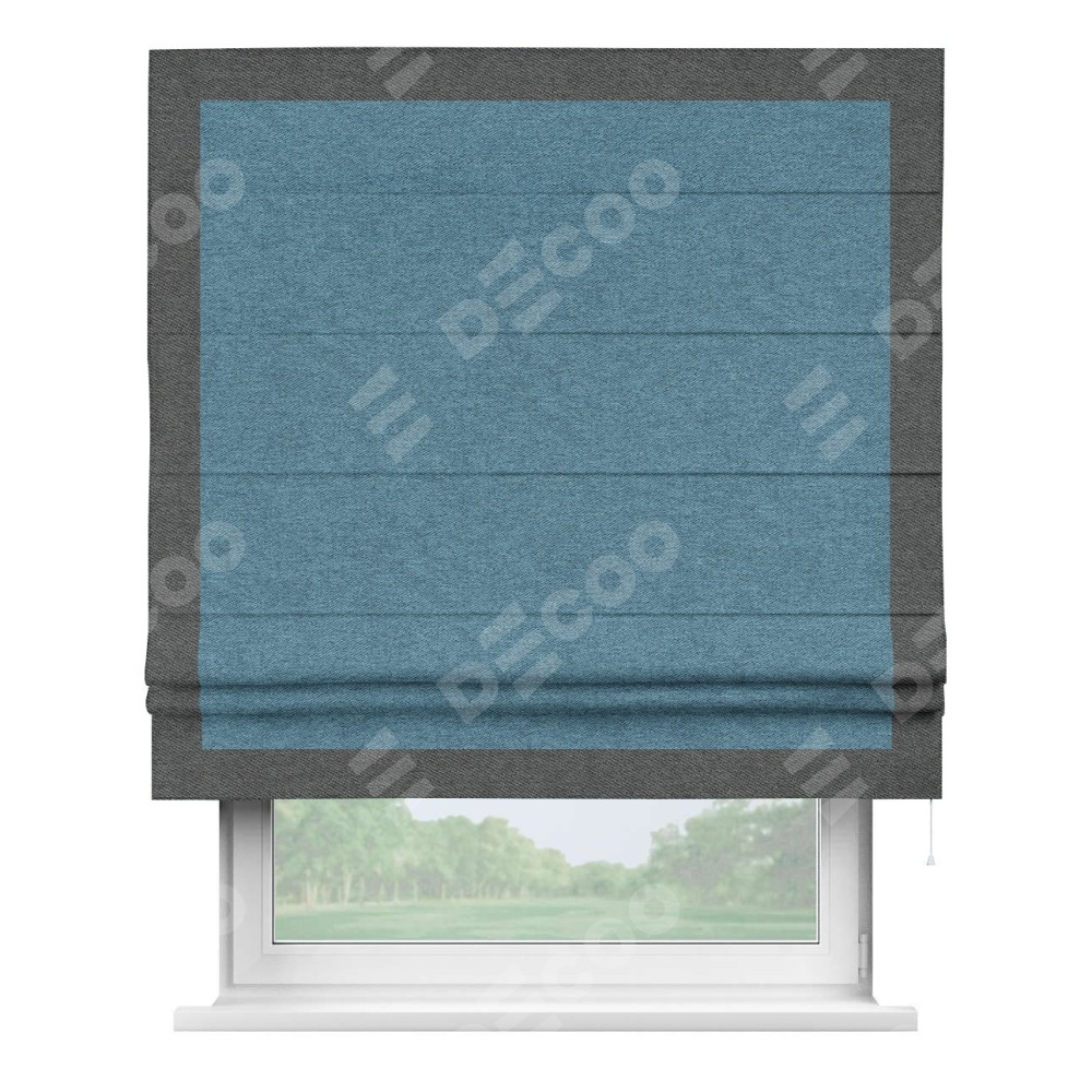 Римская штора пошита из ткани твид блэкаут светло-синий, артикул: 90935, с отделкой кантом «Чесс» отличается своей уникальной деталью — наличием канта не только по бокам и снизу, но и сверху по всем краям шторы. Это придает шторе особенно аккуратный и завершенный вид, делая акцент на границах и форме шторы. Отделка кантом по всему периметру шторы усиливает её декоративные качества и подчеркивает строгую геометрию, что может быть особенно актуально для современных и минималистичных интерьеров.