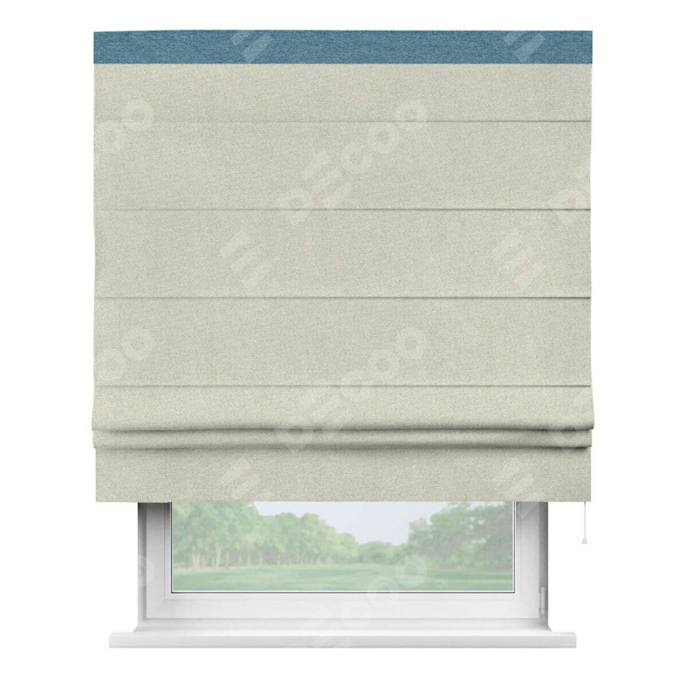 Римская штора пошита из ткани твид блэкаут шампань, артикул: 90929, с отделкой кантом «Кинг» отличается своей необычной особенностью: кант располагается исключительно сверху шторы. Такой дизайн делает акцент на верхней части окна, визуально поднимая потолок и придавая интерьеру более возвышенный и изысканный вид. Отделка кантом на верхней кромке не только украшает штору, но и может служить дополнительной защитой от износа в месте наибольшего контакта с механизмом управления шторой.