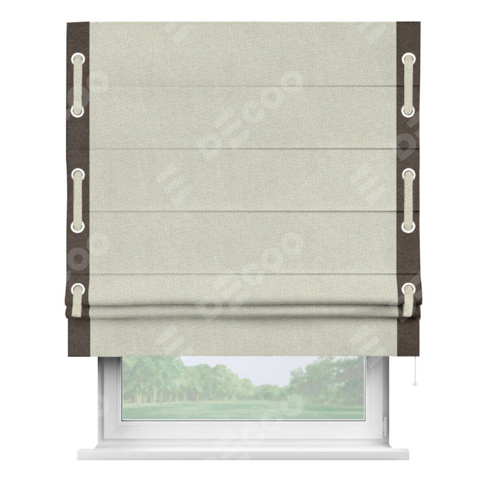Декоративные люверсы на кантах могут выполнять как чисто украшательную функцию, так и быть частью механизма для протягивания декоративного пояска, что добавляет изделию уникальности и игривости. Поясок из основного цвета римской шторы, протянутый через люверсы, не только укрепляет вертикальную композицию, но и позволяет создавать различные драпировки, регулируя внешний вид шторы по желанию.