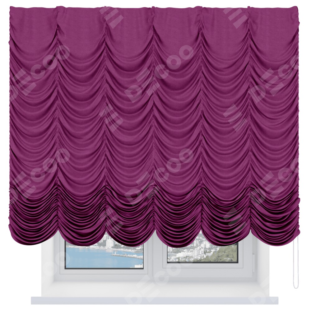 Французская штора производителя «Cortin», используется для проёма, пошита из ткани вельвет фиолетовый, артикул ткани 85552. Имеет универсальный механизм и подходит для монтажа: на потолок и на стену.