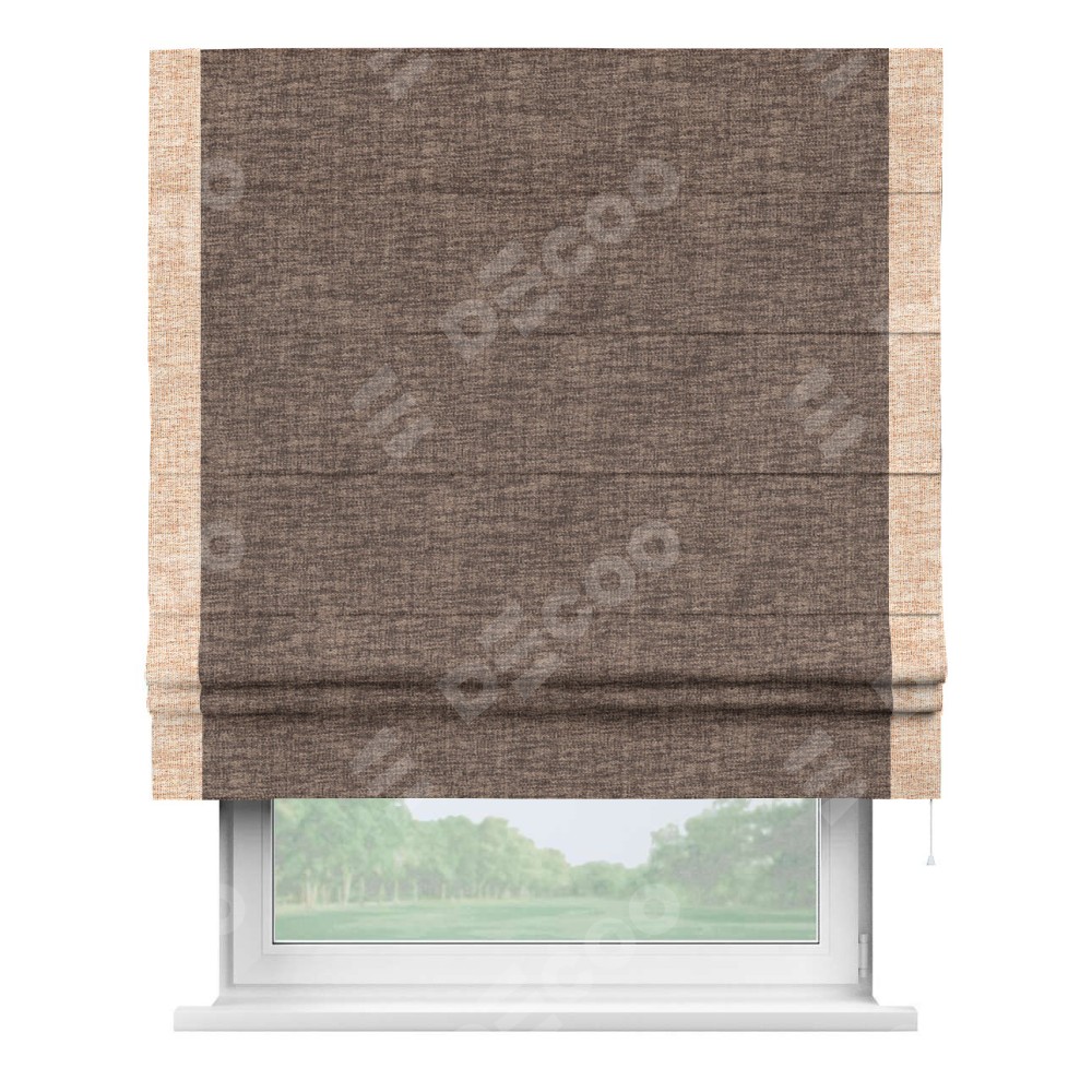 Римская штора пошита из ткани рогожка димаут коричневый, артикул: 91018, с отделкой кантом «Стрим Дуо» выделяется наличием кантов по обоим бокам шторы, слева и справа. Этот дизайн придает шторе аккуратный и завершенный вид, акцентируя вертикальные линии и визуально вытягивая окно в высоту. Отделка кантом по бокам не только украшает штору, но и служит практической функцией, укрепляя края и продлевая срок службы изделия.