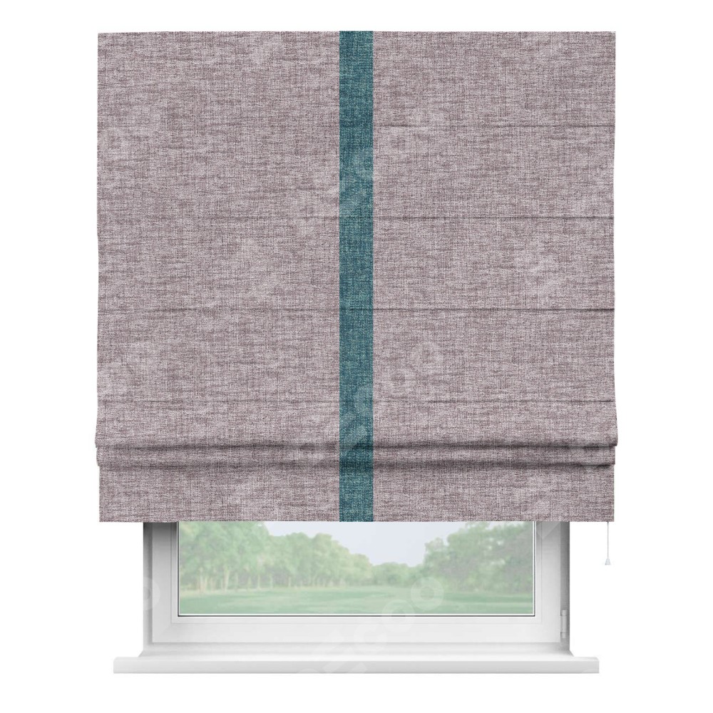 Римская штора пошита из ткани рогожка димаут розовый кварц, артикул: 91030, с отделкой кантом «Хайвэй» представляет собой уникальное и смелое дизайнерское решение, где кант расположен вертикально посередине шторы. Этот дизайн не только выделяет штору среди других вариантов оформления окон, но и создает интересный визуальный акцент, привлекая внимание к центру окна и разделяя штору на визуальные зоны. Такой нестандартный подход добавляет динамичности интерьеру и может быть использован для подчеркивания особенностей оформления помещения.