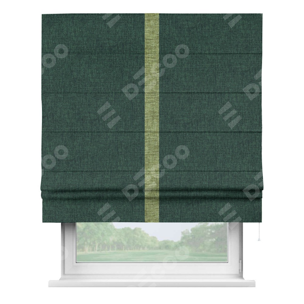 Римская штора пошита из ткани рогожка димаут тёмно-зелёный, артикул: 91022, с отделкой кантом «Хайвэй» представляет собой уникальное и смелое дизайнерское решение, где кант расположен вертикально посередине шторы. Этот дизайн не только выделяет штору среди других вариантов оформления окон, но и создает интересный визуальный акцент, привлекая внимание к центру окна и разделяя штору на визуальные зоны. Такой нестандартный подход добавляет динамичности интерьеру и может быть использован для подчеркивания особенностей оформления помещения.