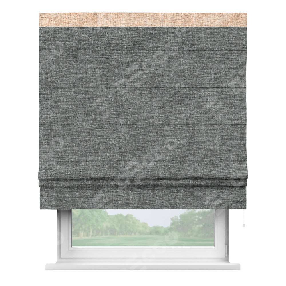 Римская штора пошита из ткани рогожка димаут тёмно-серый, артикул: 91029, с отделкой кантом «Кинг» отличается своей необычной особенностью: кант располагается исключительно сверху шторы. Такой дизайн делает акцент на верхней части окна, визуально поднимая потолок и придавая интерьеру более возвышенный и изысканный вид. Отделка кантом на верхней кромке не только украшает штору, но и может служить дополнительной защитой от износа в месте наибольшего контакта с механизмом управления шторой.