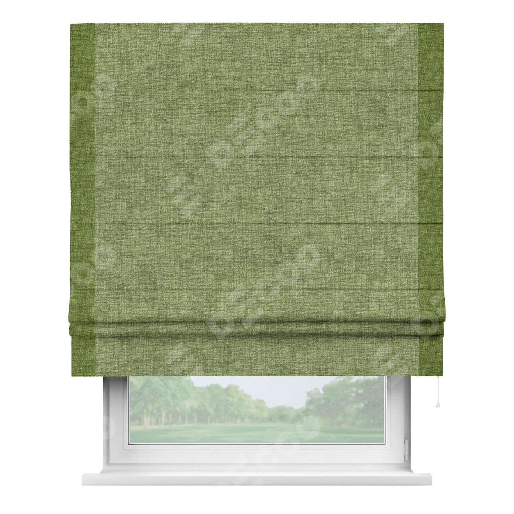 Римская штора пошита из ткани рогожка димаут травяной, артикул: 91021, с отделкой кантом «Стрим Дуо» выделяется наличием кантов по обоим бокам шторы, слева и справа. Этот дизайн придает шторе аккуратный и завершенный вид, акцентируя вертикальные линии и визуально вытягивая окно в высоту. Отделка кантом по бокам не только украшает штору, но и служит практической функцией, укрепляя края и продлевая срок службы изделия.
