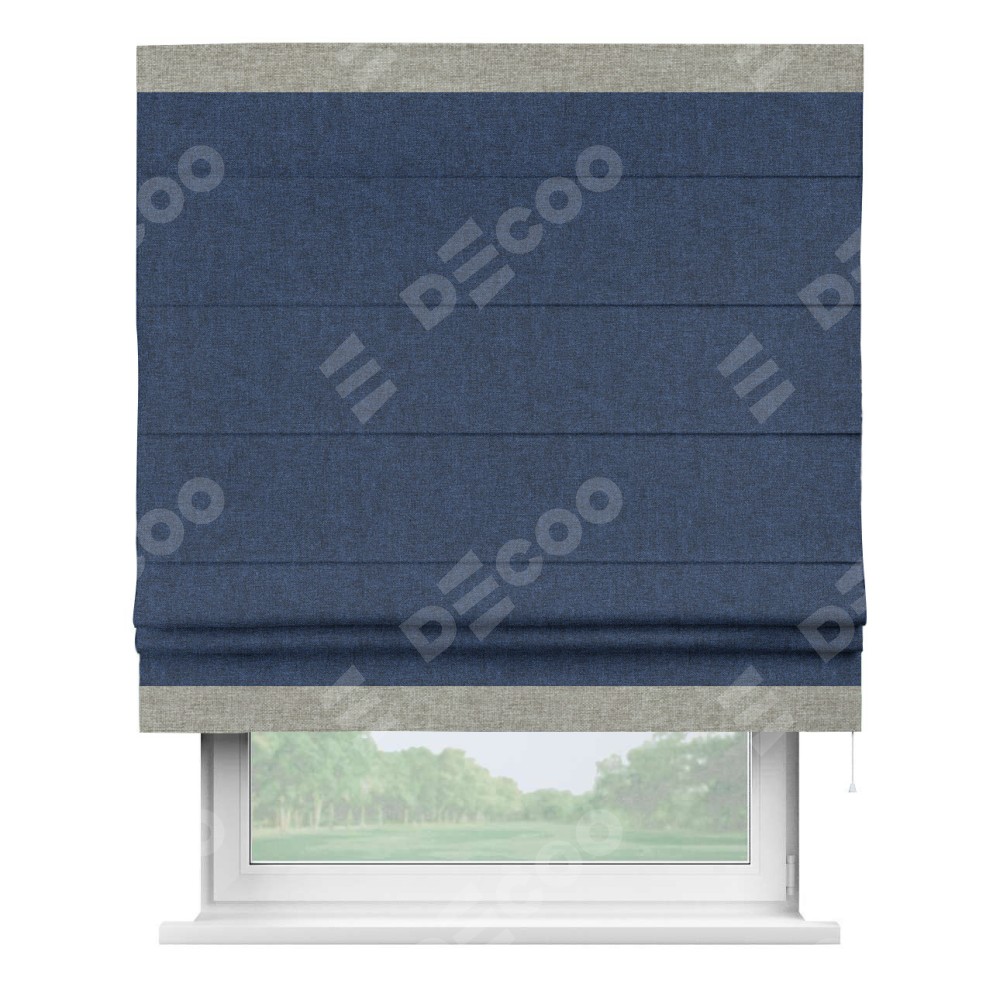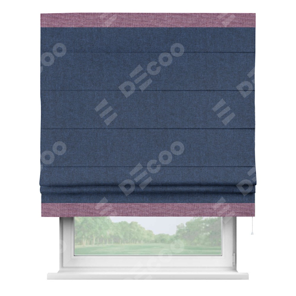 Римская штора пошита из ткани лён кашемир тёмно-синий, артикул: 17215, с отделкой кантом «Горизонт» предлагает уникальное дизайнерское решение, при котором кант располагается только вверху и снизу шторы. Такое решение делает акцент на горизонтальных линиях, визуально расширяя пространство и придавая окну более строгий и организованный вид. Отделка кантом в этих ключевых местах не только украшает штору, но и способствует её долговечности, защищая наиболее уязвимые к износу края.