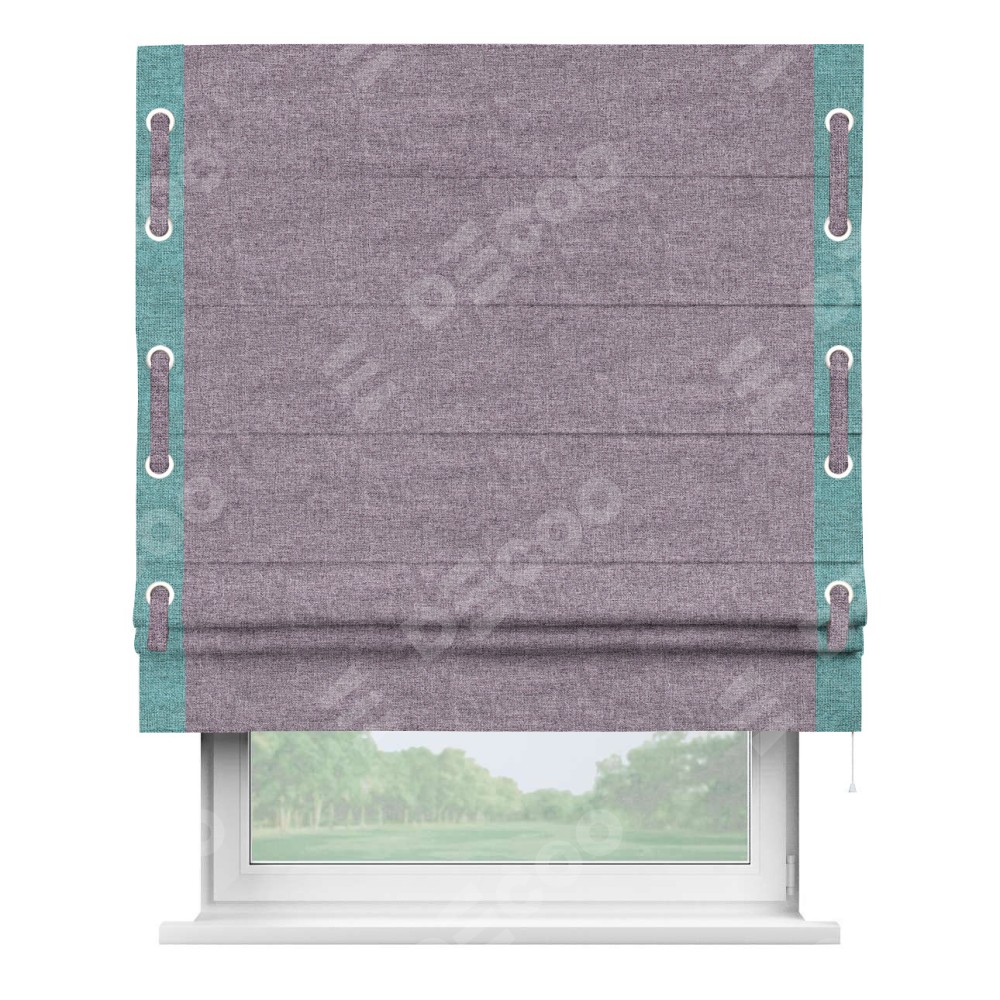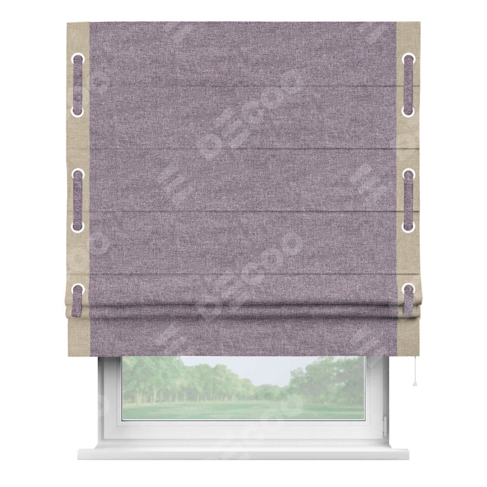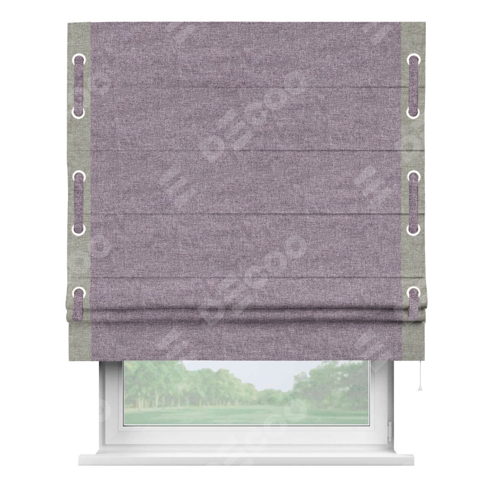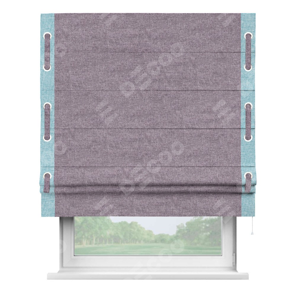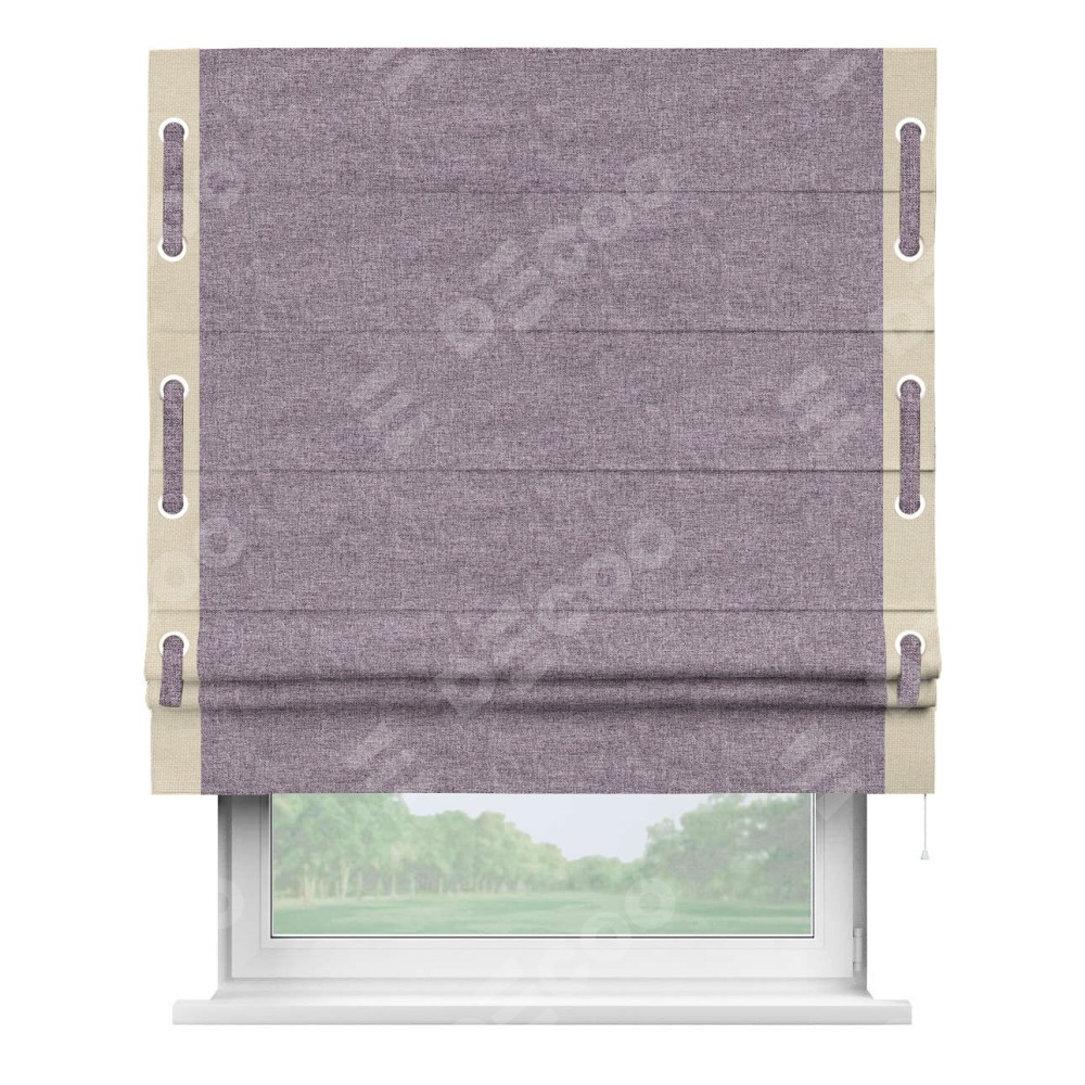 Римская штора «Кортин» для проёма, лён кашемир фиолетовый, с кантом Стрим Дуо (люверсы с пояском)