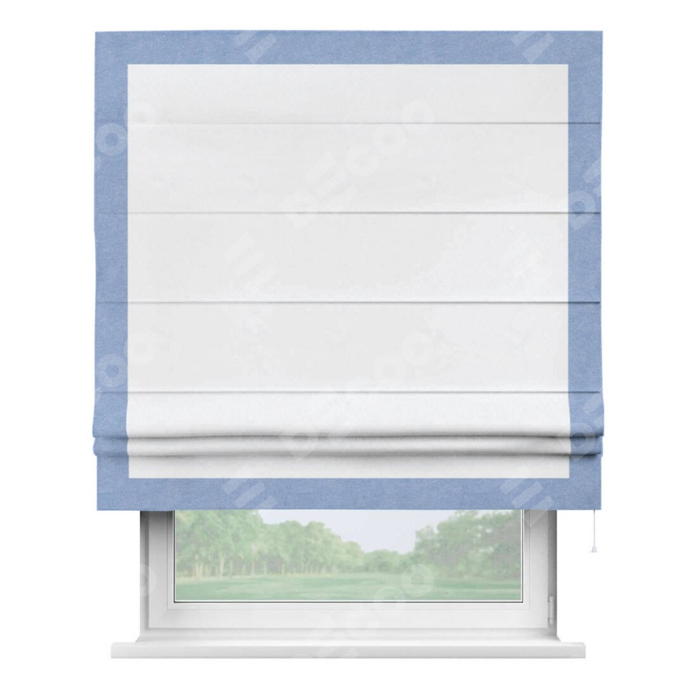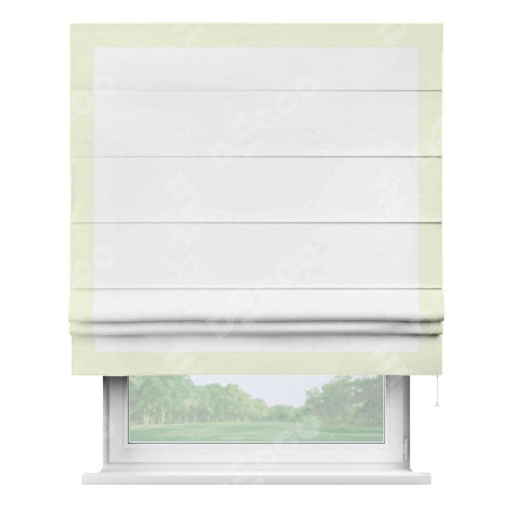 Римская штора пошита из ткани вельвет белоснежный, артикул: 92698, с отделкой кантом «Чесс» отличается своей уникальной деталью — наличием канта не только по бокам и снизу, но и сверху по всем краям шторы. Это придает шторе особенно аккуратный и завершенный вид, делая акцент на границах и форме шторы. Отделка кантом по всему периметру шторы усиливает её декоративные качества и подчеркивает строгую геометрию, что может быть особенно актуально для современных и минималистичных интерьеров.