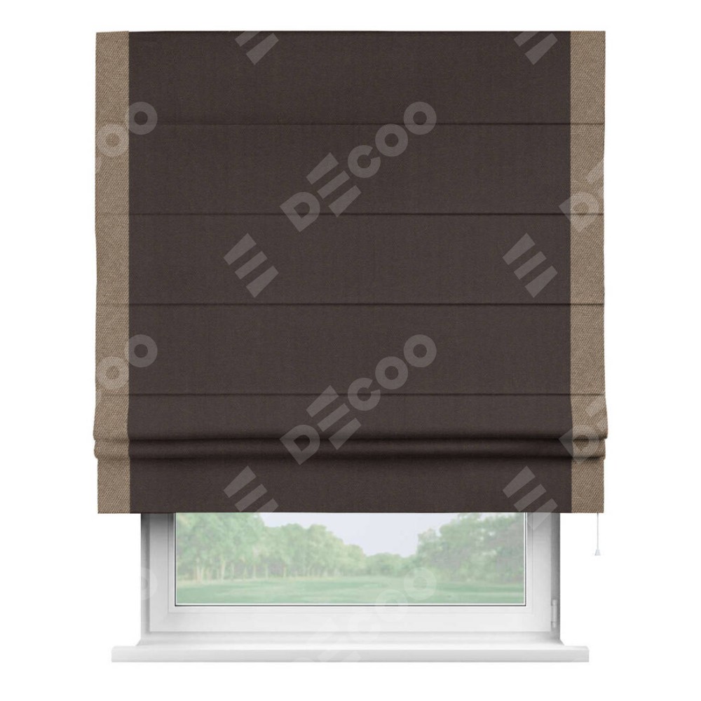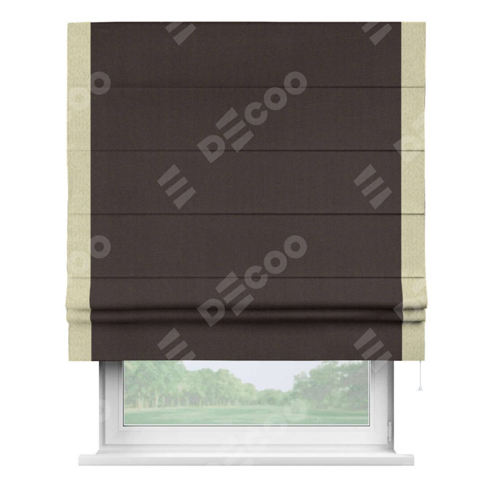 Римская штора пошита из ткани лён димаут венге, артикул: 91001, с отделкой кантом «Стрим Дуо» выделяется наличием кантов по обоим бокам шторы, слева и справа. Этот дизайн придает шторе аккуратный и завершенный вид, акцентируя вертикальные линии и визуально вытягивая окно в высоту. Отделка кантом по бокам не только украшает штору, но и служит практической функцией, укрепляя края и продлевая срок службы изделия.