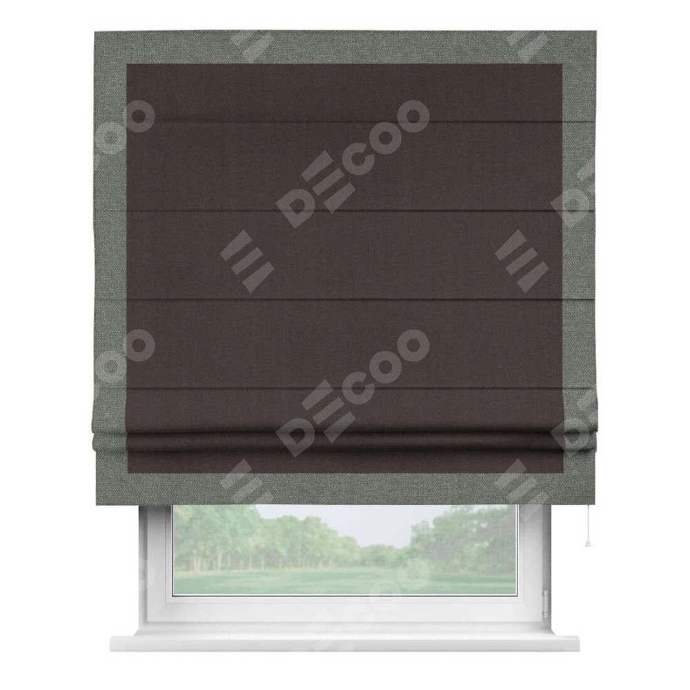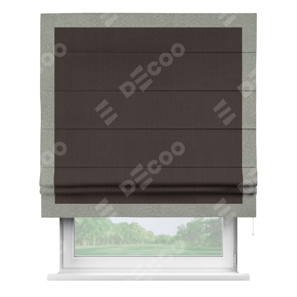 Римская штора пошита из ткани лён димаут венге, артикул: 91001, с отделкой кантом «Чесс» отличается своей уникальной деталью — наличием канта не только по бокам и снизу, но и сверху по всем краям шторы. Это придает шторе особенно аккуратный и завершенный вид, делая акцент на границах и форме шторы. Отделка кантом по всему периметру шторы усиливает её декоративные качества и подчеркивает строгую геометрию, что может быть особенно актуально для современных и минималистичных интерьеров.
