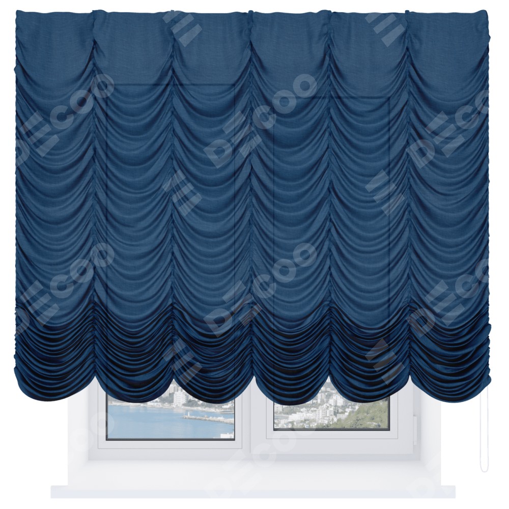 Французская штора производителя «Cortin», используется для проёма, пошита из ткани лён синий, артикул ткани 104496. Имеет универсальный механизм и подходит для монтажа: на потолок и на стену.