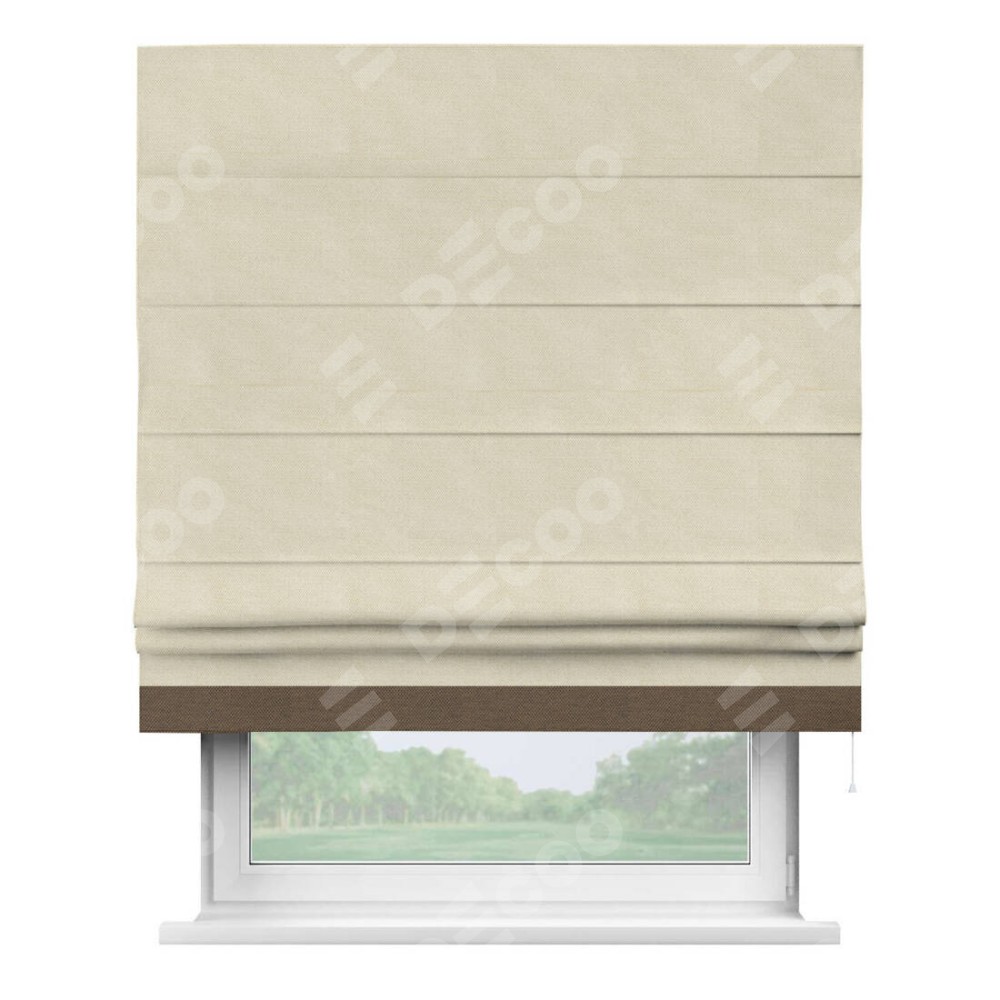 Римская штора производителя «Cortin», используется для проёма, пошита из ткани лён димаут бежевый, артикул 83023. Отделка шторы кантом «Джестер», ткань для канта используется из льна димаут разной расцветки на выбор. Имеет универсальный механизм и подходит для монтажа: на потолок, на стену и в нишу.