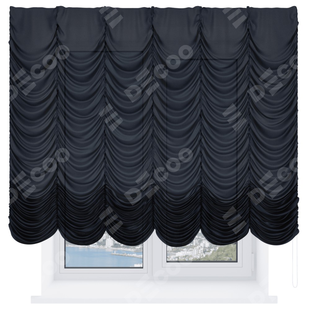 Французская штора производителя «Cortin», используется для проёма, пошита из ткани лён черный, артикул ткани 140815. Имеет универсальный механизм и подходит для монтажа: на потолок и на стену.