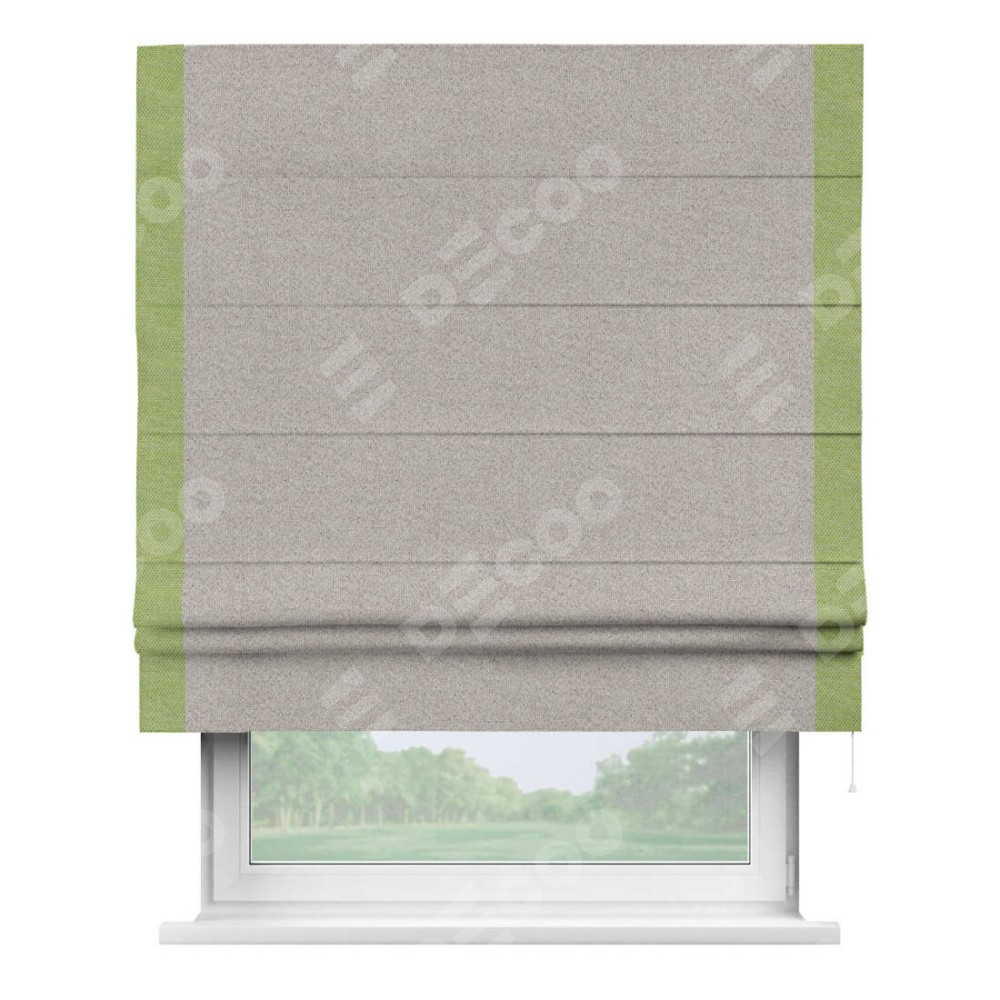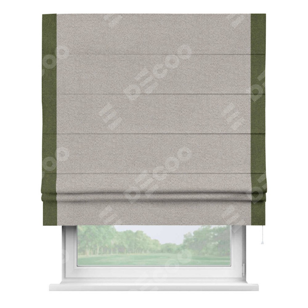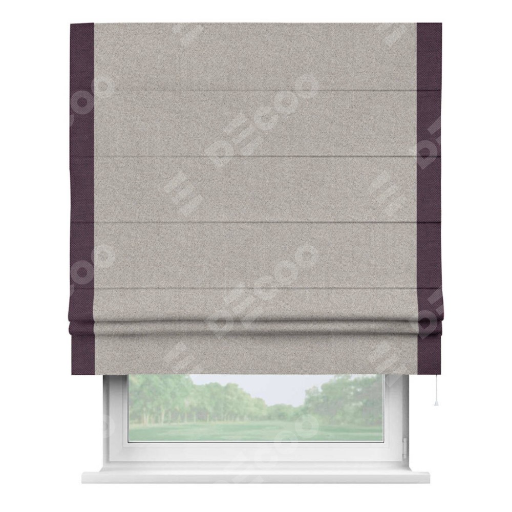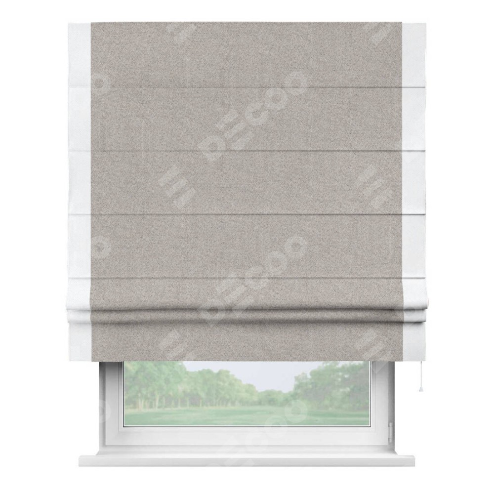 Римская штора «Кортин» для проема, лён димаут серо-бежевый с кантом Стрим Дуо