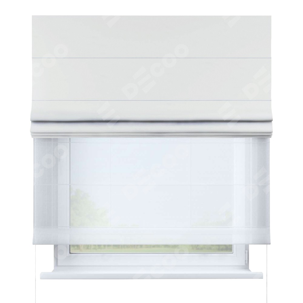 Двойная римская штора «День-ночь» от производителя Cortin предназначена для использования в проёмах. Эта штора уникальна тем, что состоит из двух полотен. На лицевой стороне находится лён димаут молочный (артикул: 29), обеспечивающий эффективное затемнение. В комплект также входит вторая ткань — легкий белый тюль (артикул: V-01), который добавляет изящества и легкости оформлению окна. Кроме того, доступны и другие разновидности ткани тюль, выбор которых доступен по ссылке .