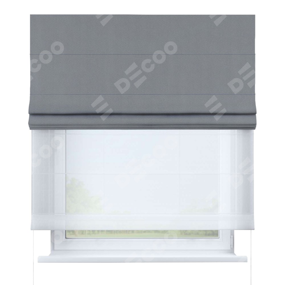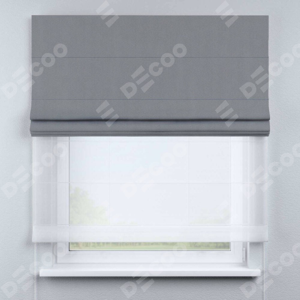 Двойная римская штора «День-ночь» от производителя Cortin предназначена для использования в проёмах. Эта штора уникальна тем, что состоит из двух полотен. На лицевой стороне находится однотонный блэкаут серый (артикул: 146436), обеспечивающий эффективное затемнение. В комплект также входит вторая ткань — легкий белый тюль (артикул: V-01), который добавляет изящества и легкости оформлению окна. Кроме того, доступны и другие разновидности ткани тюль, выбор которых доступен по  ссылке .