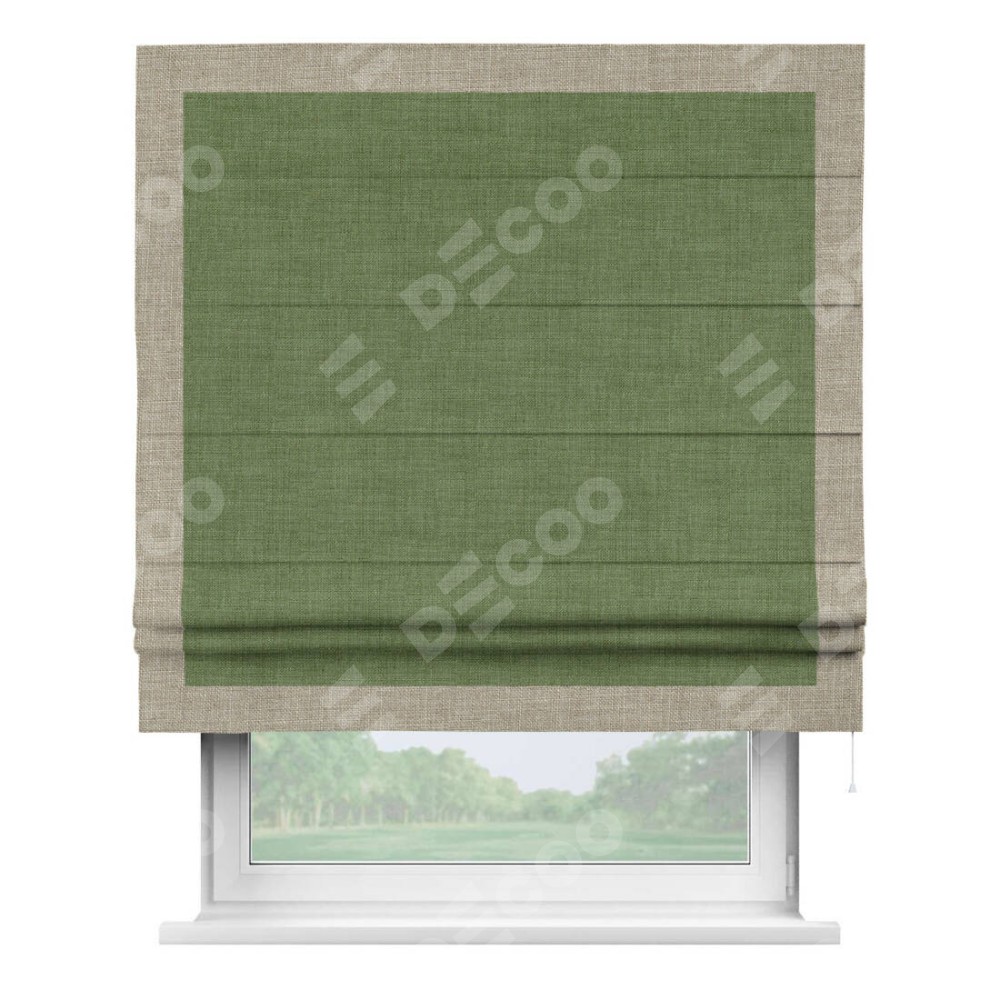 Классическая римская штора производителя «Cortin», пошита из ткани лён зелёный, артикул: 131547. Имеет универсальный механизм и подходит для монтажа: на потолок, на стену и в нишу.