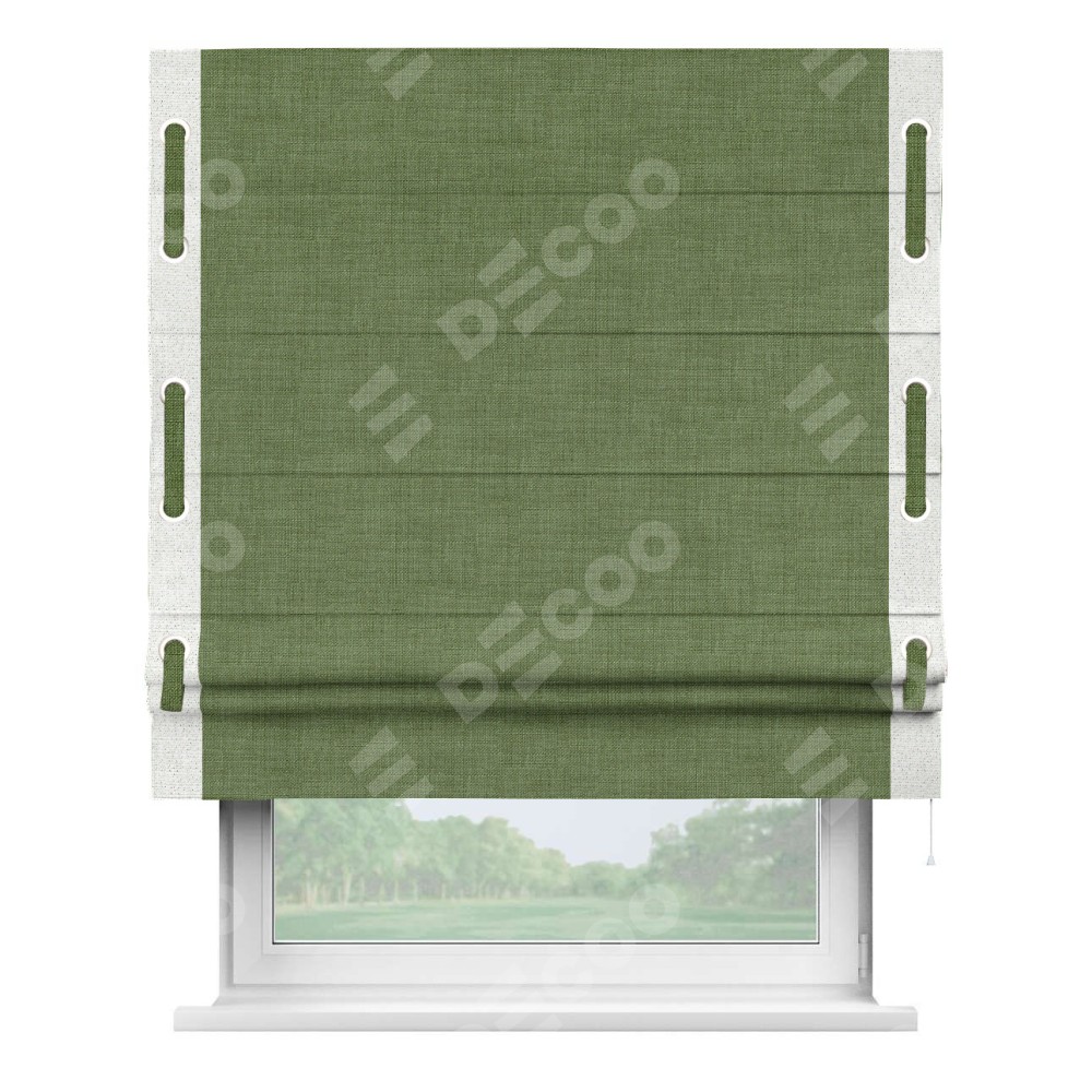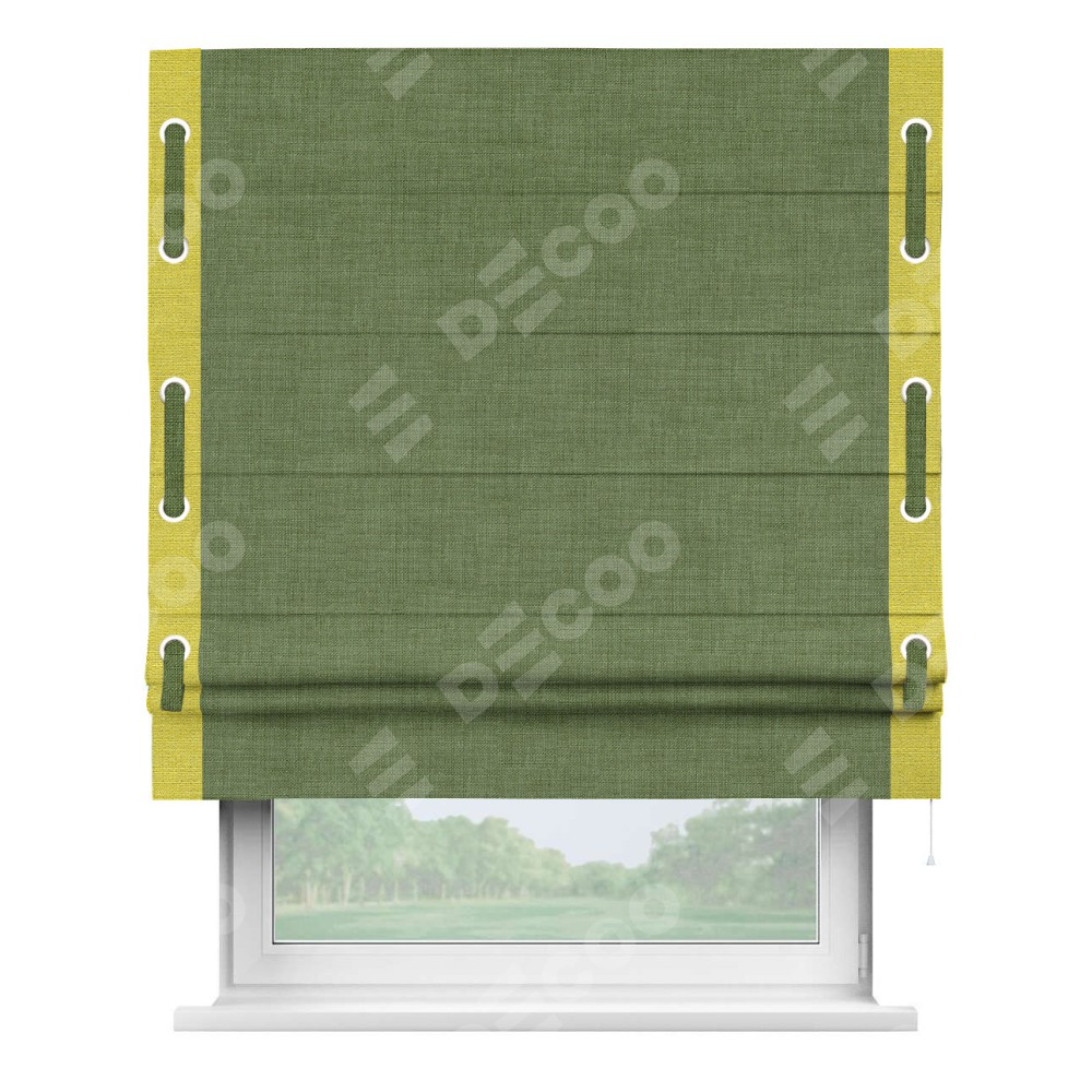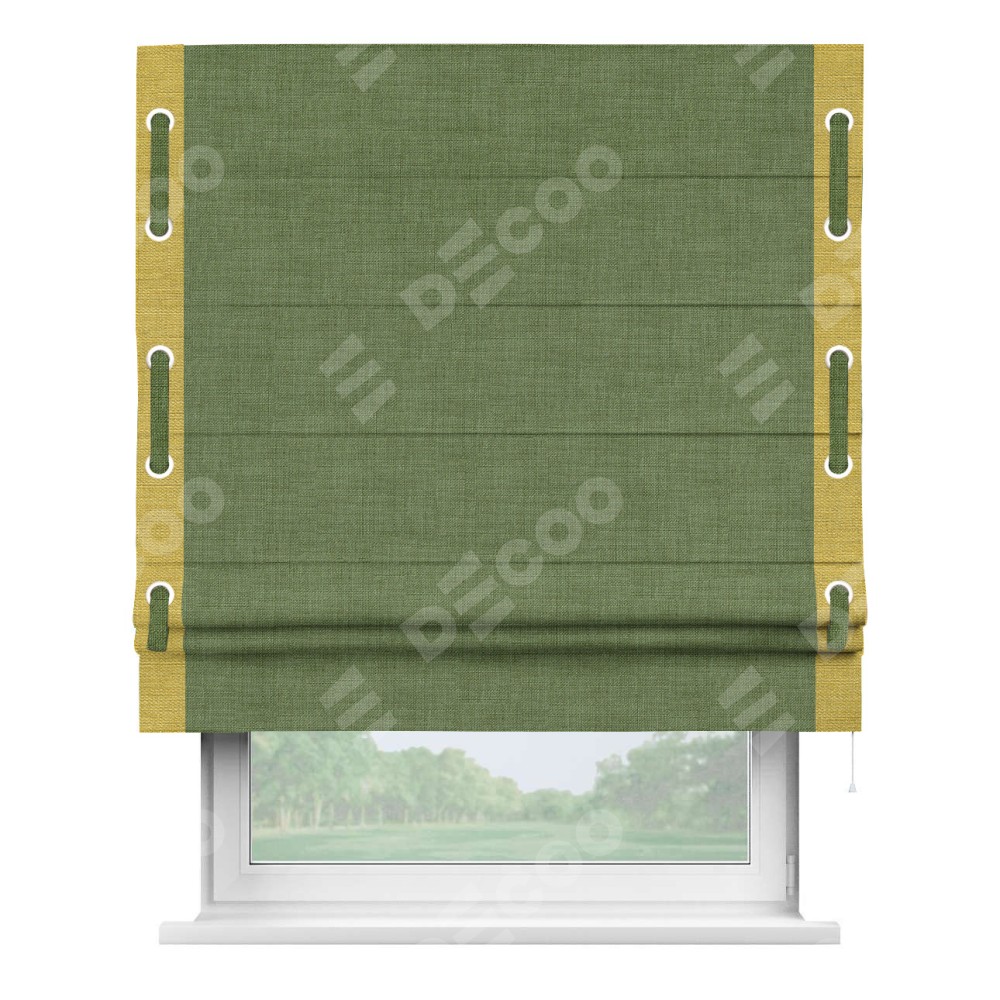 Римская штора «Кортин» для проёма, лён зелёный, с кантом Стрим Дуо (люверсы с пояском)