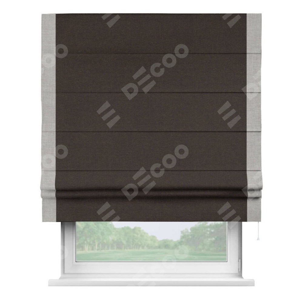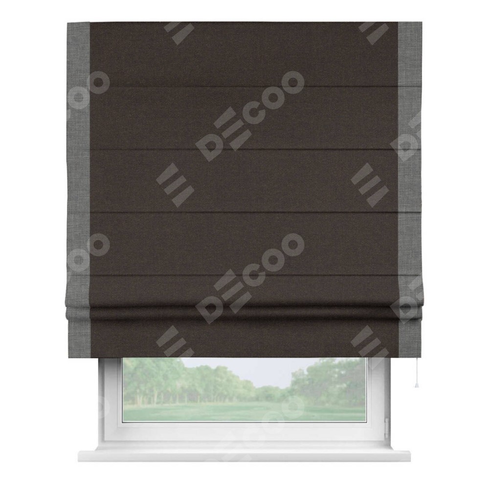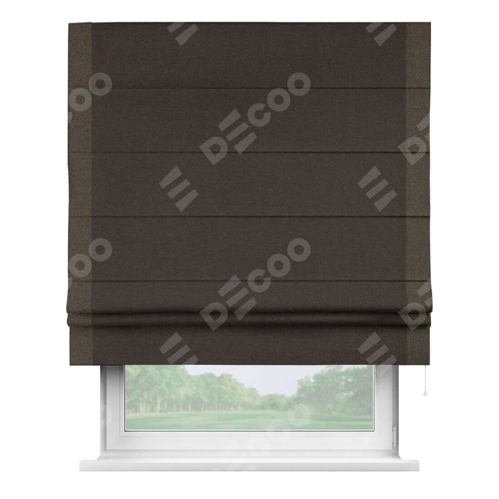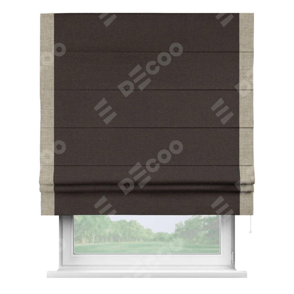 Классическая римская штора производителя «Cortin», пошита из ткани лён тёмно-коричневый, артикул: 104497. Имеет универсальный механизм и подходит для монтажа: на потолок, на стену и в нишу.