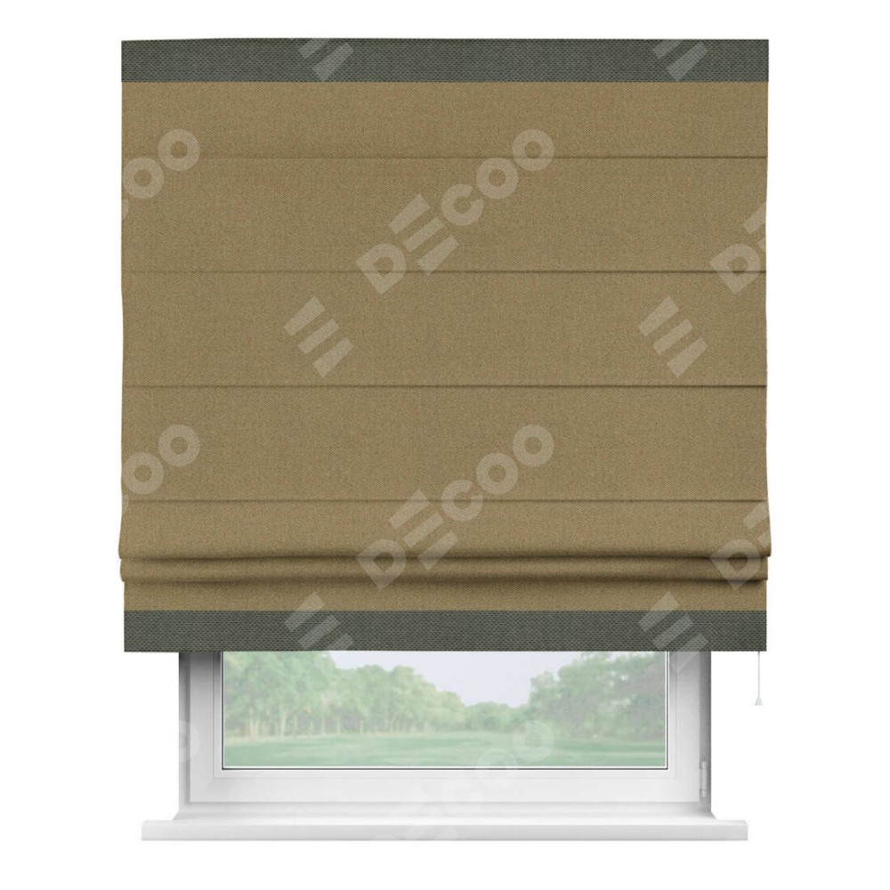 Римская штора производителя «Cortin», используется для проёма, пошита из ткани лён димаут оливковый, артикул 16243. Отделка шторы кантом «Горизонт», ткань для канта используется из льна димаут разной расцветки на выбор. Имеет универсальный механизм и подходит для монтажа: на потолок, на стену и в нишу.