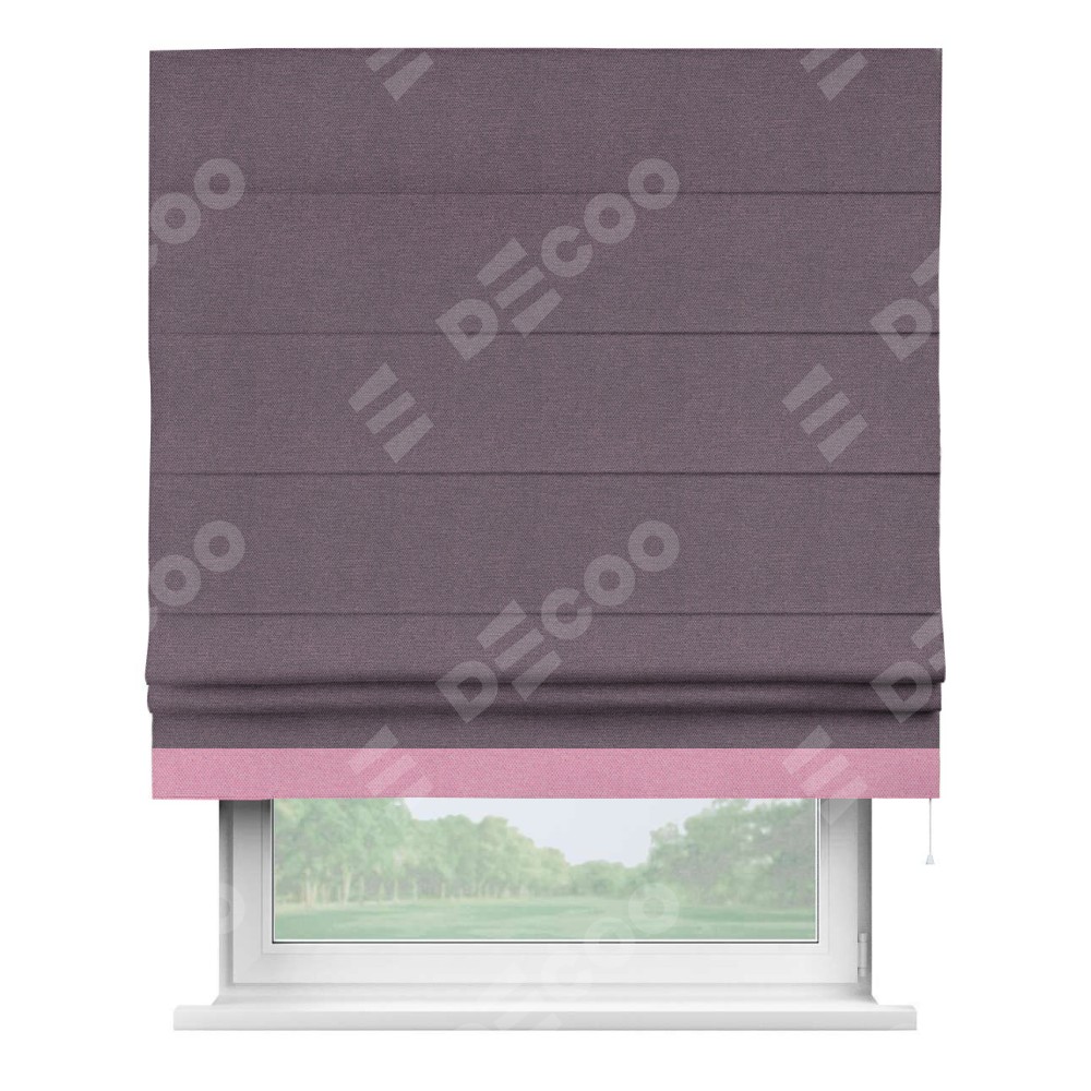 Римская штора производителя «Cortin», используется для проёма, пошита из ткани лён димаут светло-фиолетовый, артикул 83034. Отделка шторы кантом «Джестер», ткань для канта используется из льна димаут разной расцветки на выбор. Имеет универсальный механизм и подходит для монтажа: на потолок, на стену и в нишу.