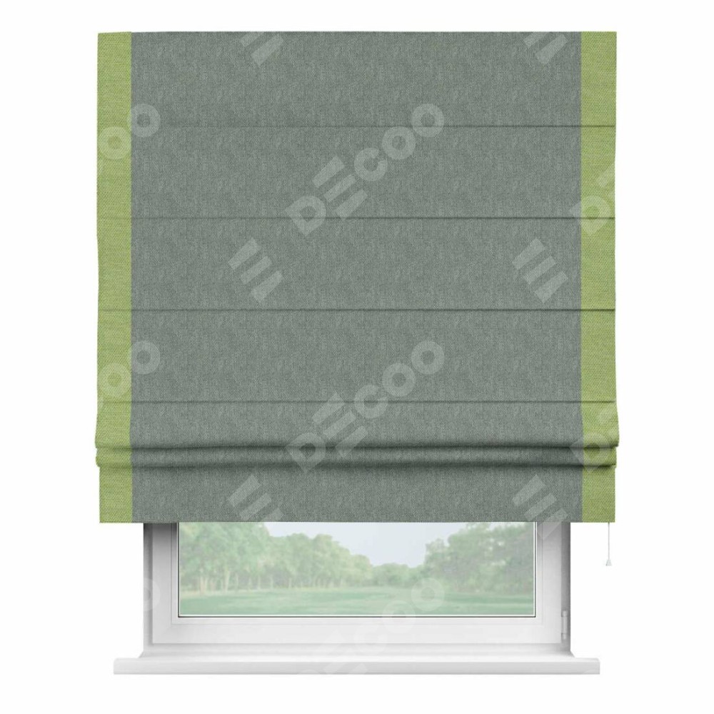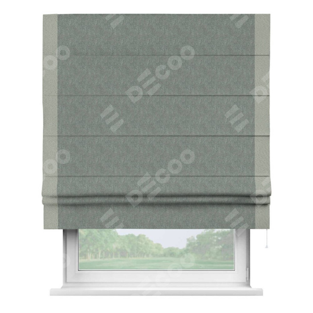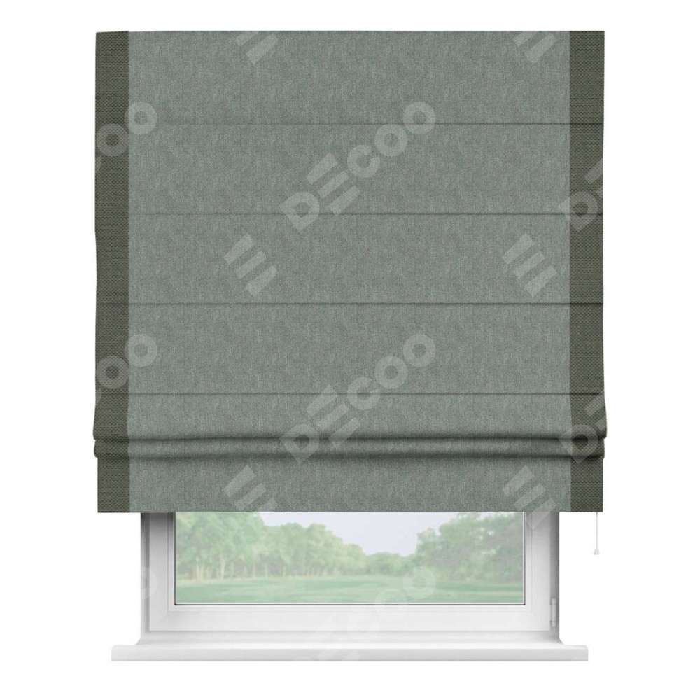 Римская штора производителя «Cortin», используется для проёма, пошита из ткани лён димаут серый, артикул 16240. Отделка шторы кантом «Стрим Дуо», ткань для канта используется из льна димаут разной расцветки на выбор. Имеет универсальный механизм и подходит для монтажа: на потолок, на стену и в нишу.