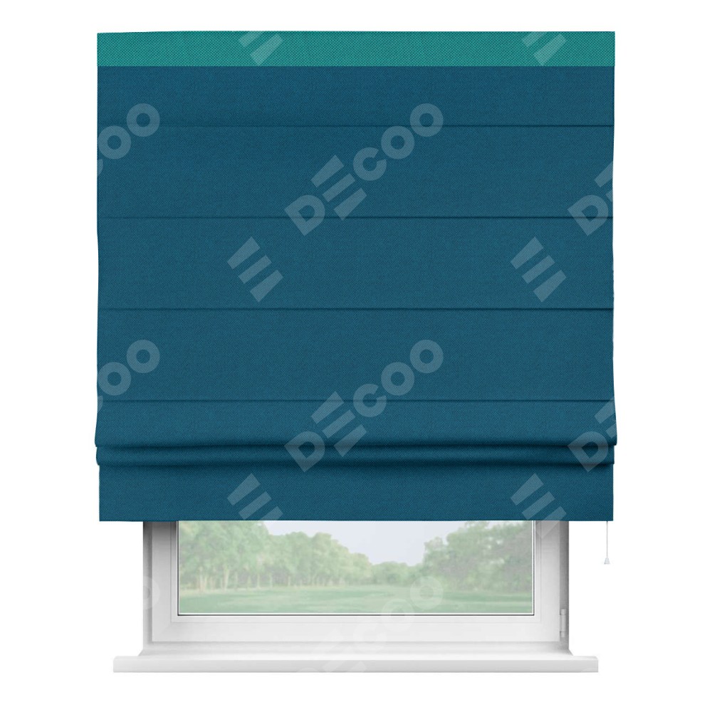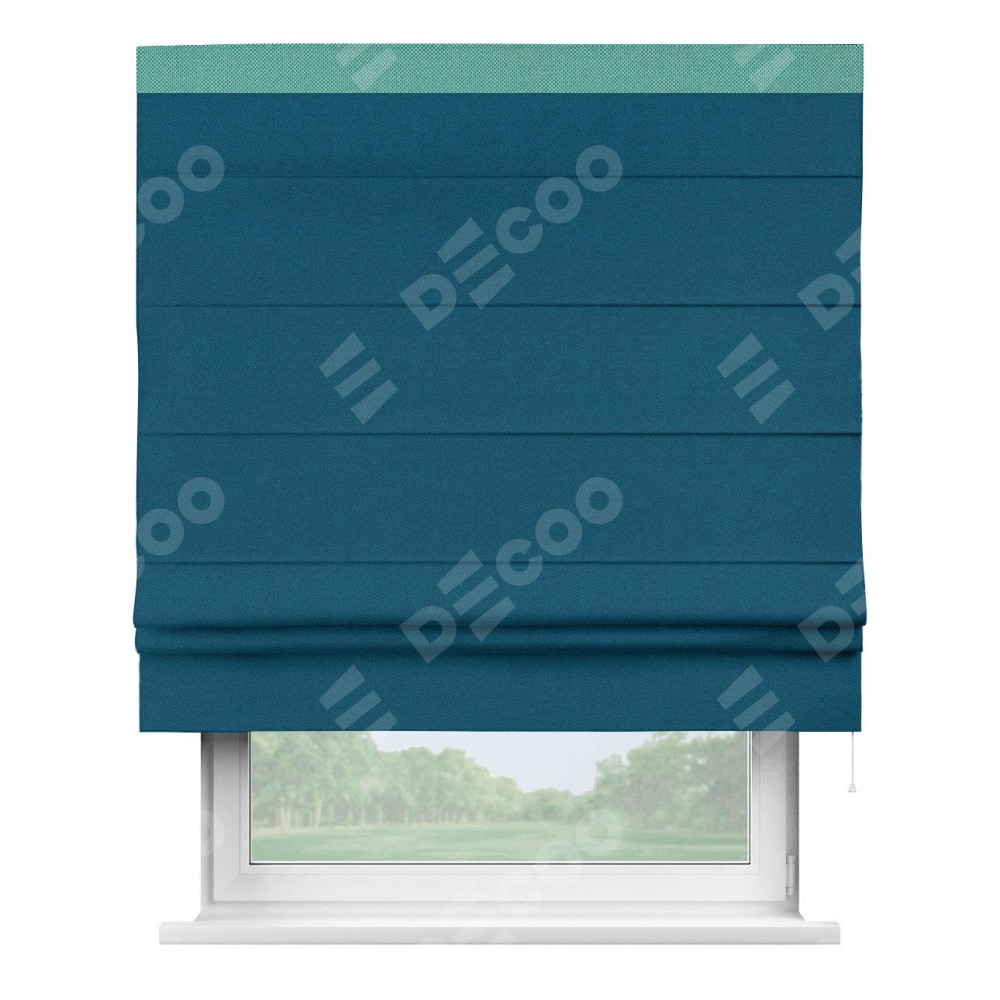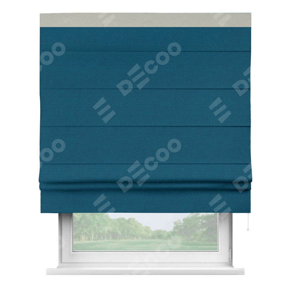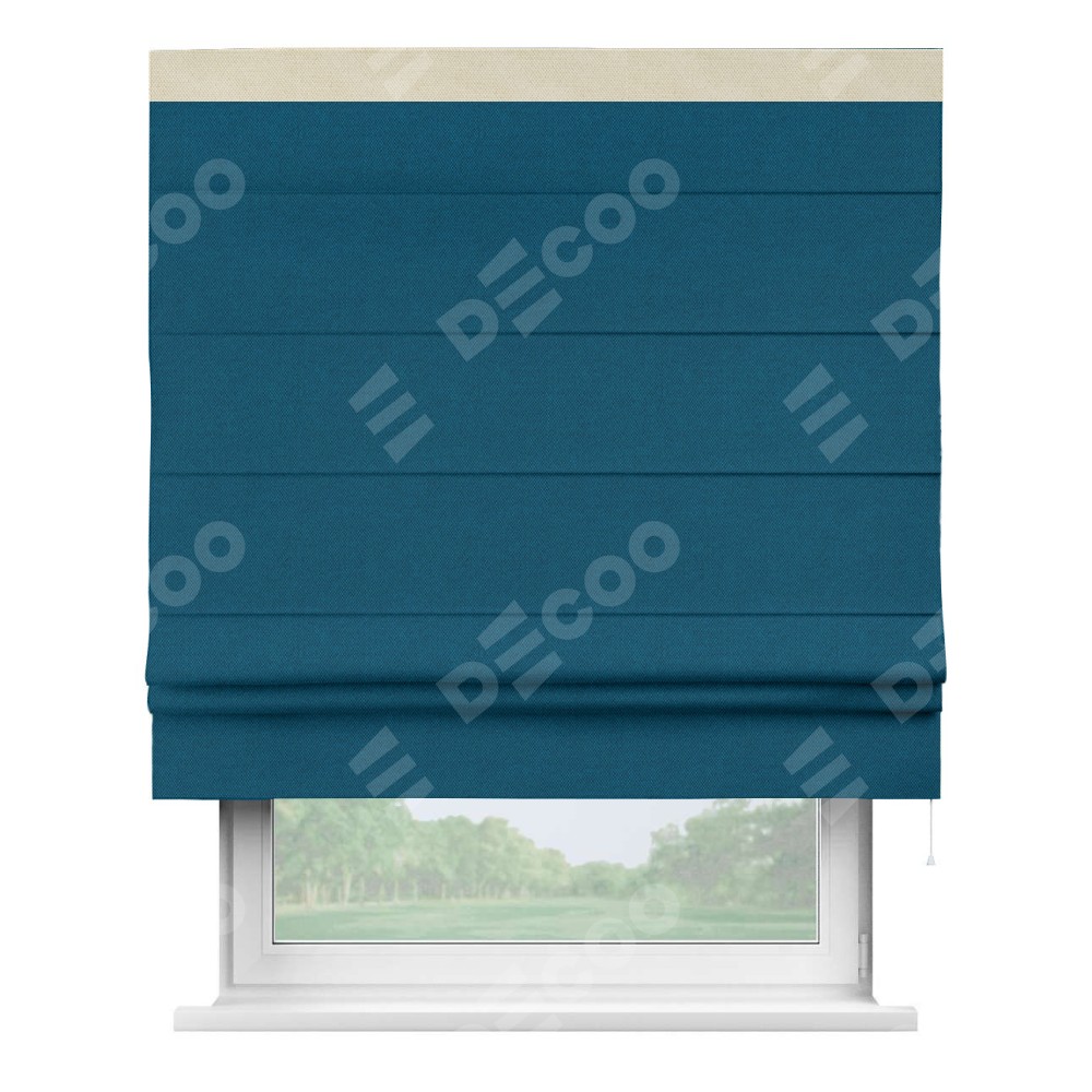 Римская штора производителя «Cortin», используется для проёма, пошита из ткани лён димаут синий, артикул 16260. Отделка шторы кантом «Кинг», ткань для канта используется из льна димаут разной расцветки на выбор. Имеет универсальный механизм и подходит для монтажа: на потолок, на стену и в нишу.
